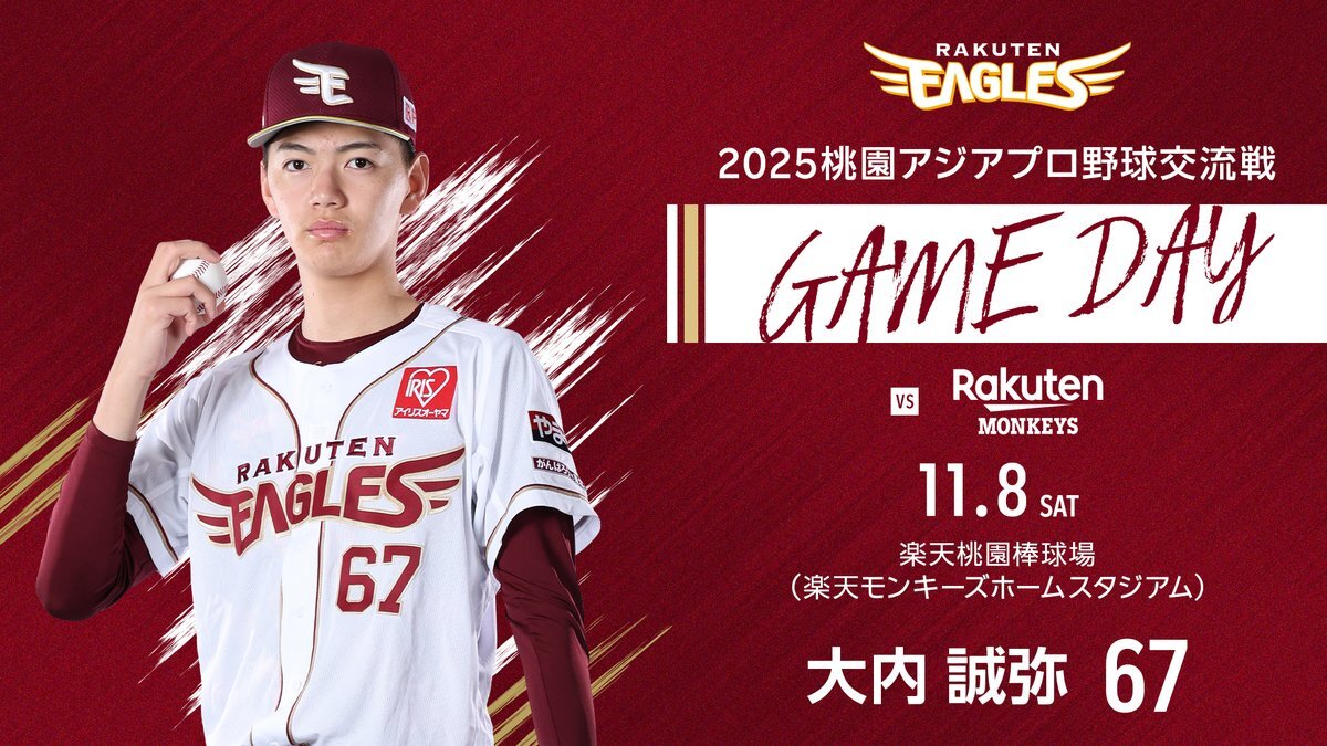 2025.11.8 vs.楽天モンキーズ(台湾) 本日のスタメンはこちらです。 #大内誠弥 選手と #堀内謙伍 選手のバッテリー! 応援よろしくお願いします📣 #RakutenEagles #2025桃園アジアプロ野球交流戦 pic.x.com/RMfIimc3b1