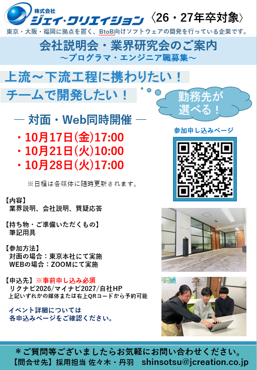 急に肌寒くなり秋らしくなりましたね🍁10月後半のイベント日程です!#27卒就活 #27卒と繋がりたい #27卒とつながりたい #就活生と繋がりたい #就活垢 #就活生 #就活 #IT業 #マイナビ2027 #就活垢 #就活生 #リクナビ2026 #会社説明会 #IT企業 #2026卒 #2026卒と繋がりたい #2026年卒 #新卒会社説明会 pic.x.com/g3x6j66oYX