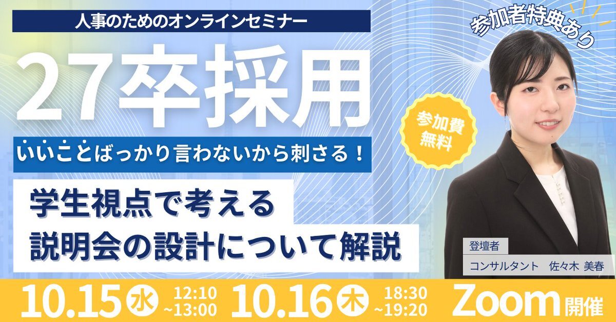 📢セミナー開催のお知らせ 今月のセミナーでは #27卒採用 の説明会設計についてお伝えします✨ 今回もご参加いただいた方にはすぐに使える特典を差し上げる予定です👀 日時 10/15(水) 12:10~ 10/16(木) 18:30~ (各回の内容は同じ) 実施方法 Zoomでのオンライン開催 pic.x.com/XQHnhX73TA