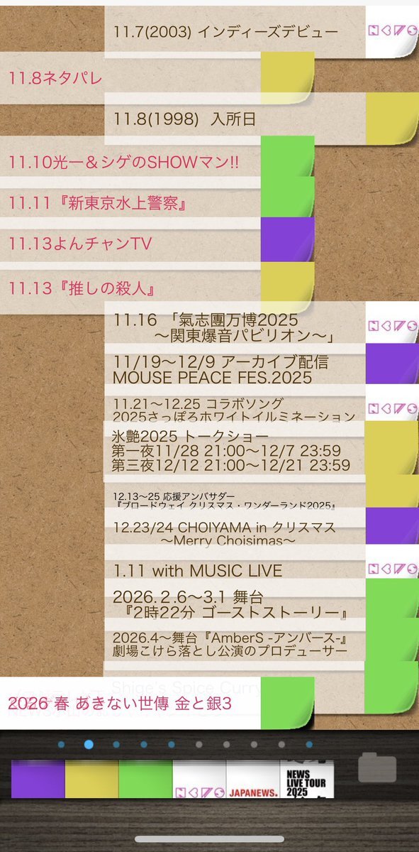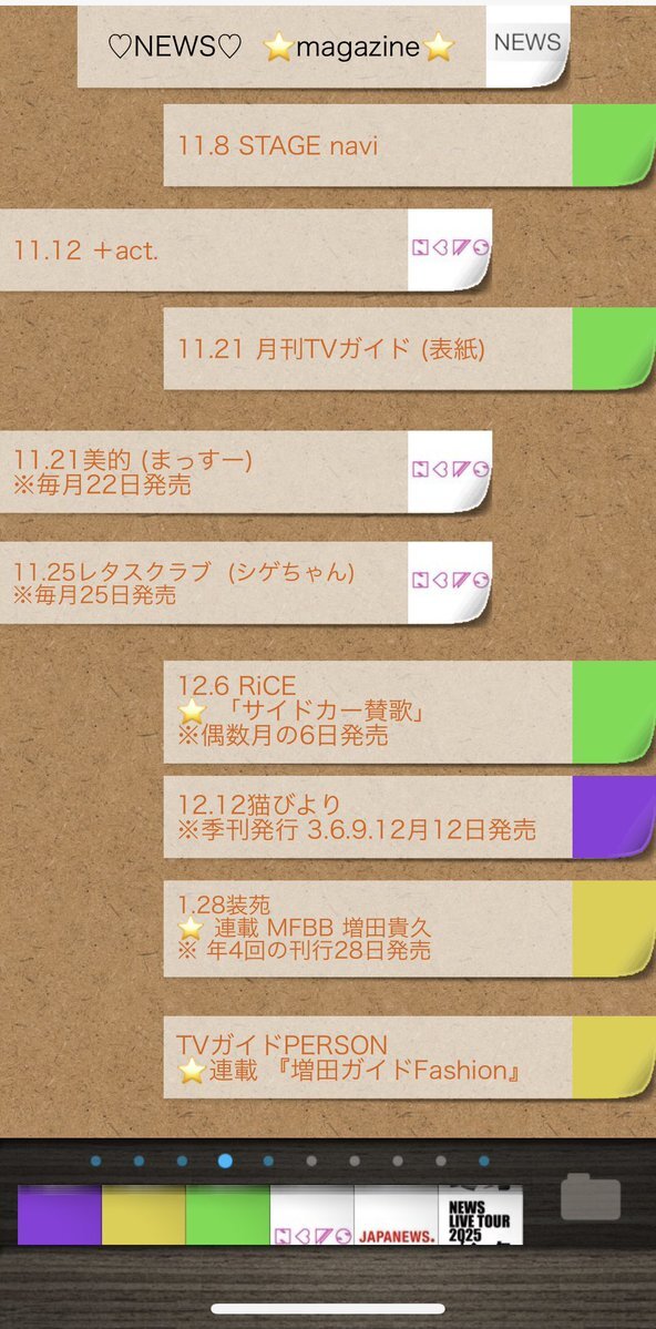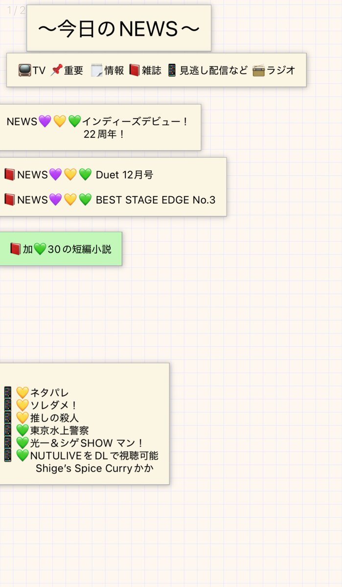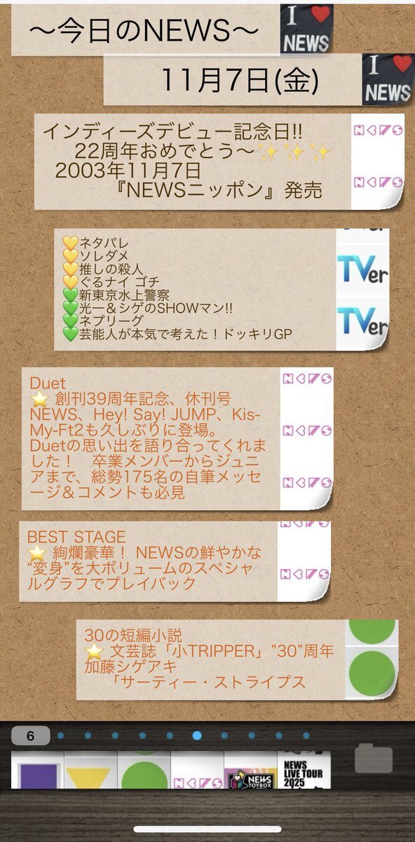 11/7金『今日のNEWS 』&付箋オマトメ💜💛💚 NEWS メジャーデビュー記念日!!22周年おめでとう〜✨ #NEWSインディーズデビュー22周年 #duet #BESTSTAGE シゲちゃん #30の短編小説 #小山慶一郎 #増田貴久 #加藤シゲアキ pic.x.com/nQag80ZN5C