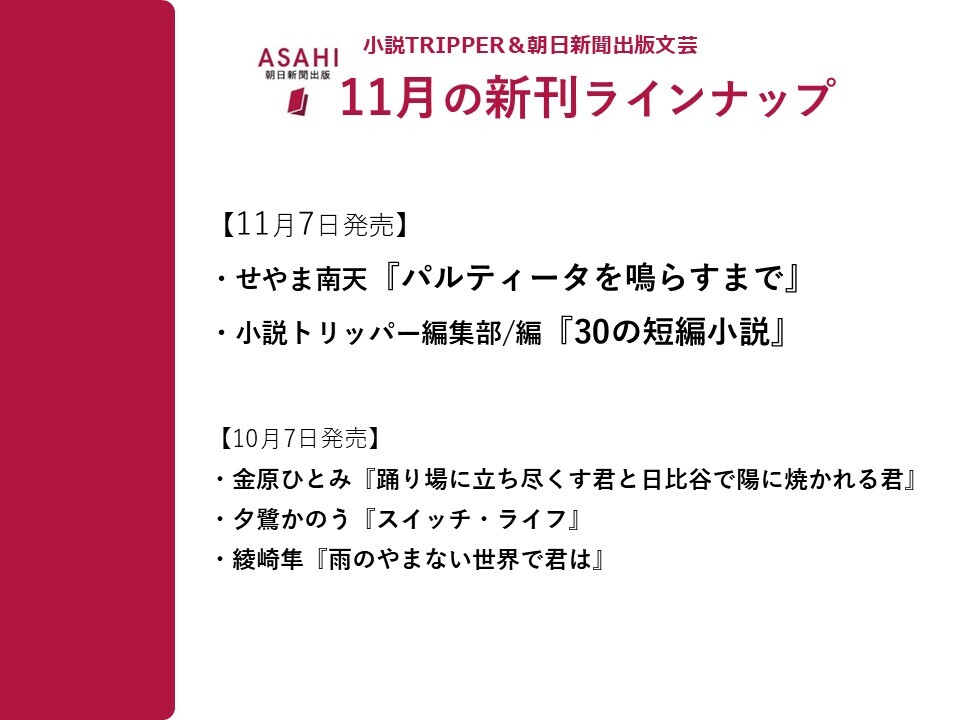 \\#朝日新聞出版 文芸・11月の新刊ラインナップ// #小説TRIPPER 編集部『#30の短編小説#せやま南天#パルティータを鳴らすまで』 よろしくお願いいたします✨✨ pic.x.com/LNap3NtELM