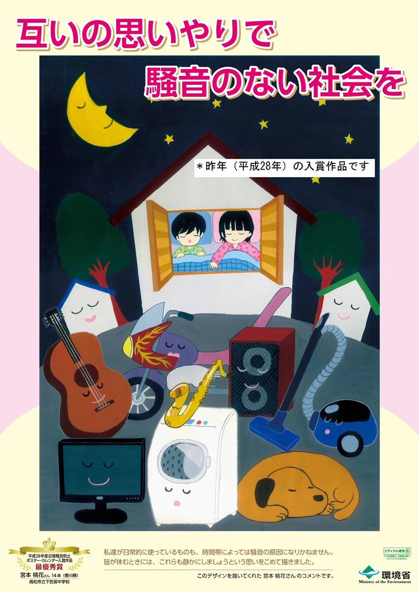 環境省の 【近隣騒音防止ポスター・カレンダー】 「互いの思いやりで   騒音のない社会を」 思いやりで騒音のないやさしい社会。部活騒音も入れて欲しい。 #30日は騒音撲滅の日 #騒音 #30日は騒音の日 #30日は騒音被害をなくす為に罰則導入を求めます x.com/Kankyo_Jpn/sta…