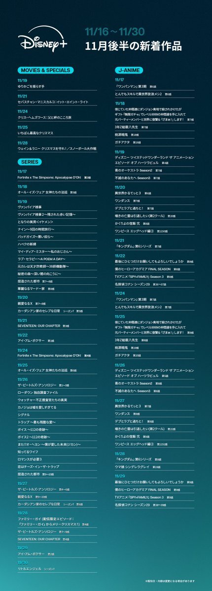 #ディズニープラス 11/16-11/30 新着作品リスト🎬 20世紀スタジオ製作の心理スリラー 『#ゆりかごを揺らす手』 ドキュメンタリー・シリーズ “アンソロジー”のリマスター🎞 『ザ・ビートルズ・アンソロジー』 令和に蘇った<名作>をお届け🍂 月間予定👇 disneyplus.disney.co.jp/recommend/late…