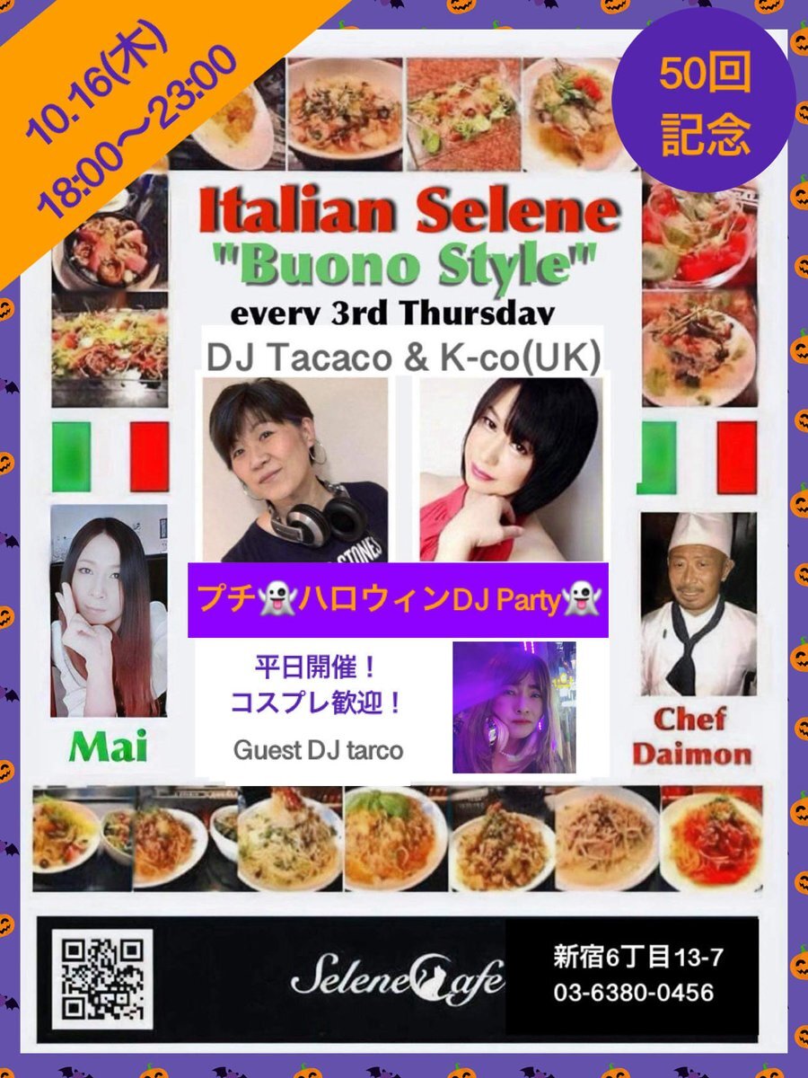 Buono Style プチハロウィンNight & 50回記念✨ スタッフ、DJ、友人たち、お客様皆様のおかげで続けてられて感謝です! 平日ハロウィンコスプレ歓迎!50回記念もあるので遊びに来てくれると嬉しいです #dj #vdj #セレーネカフェ #新宿 #italian #50回記念 #Halloween # pic.x.com/lFbN6HEbu8
