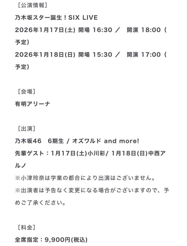 昨夜発表された乃木坂46 6期生での乃木坂スタ誕ライブ開催 乃木坂スター誕生!SIX LIVE 会場は有明アリーナ 日時は2026年1⽉17⽇(土) と18(日) の2days 本日から18日(火)いっぱいでモバイル会員先行受付、25日(火)夕方からの当落発表 #乃木坂46 #乃木坂スター誕生SIXLIVE #有明アリーナ #6期生 pic.x.com/nGXHhkbBcg