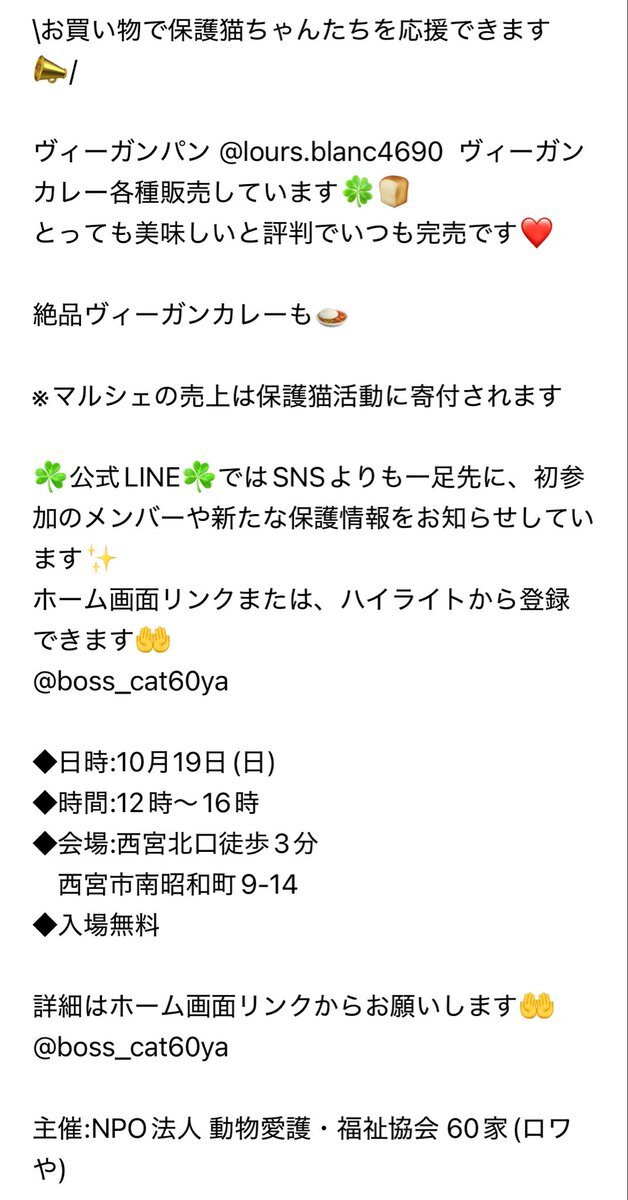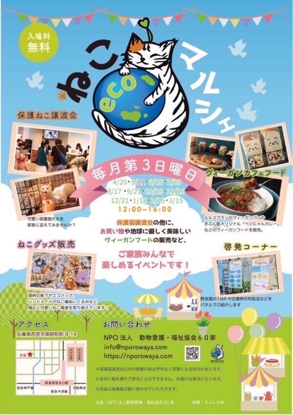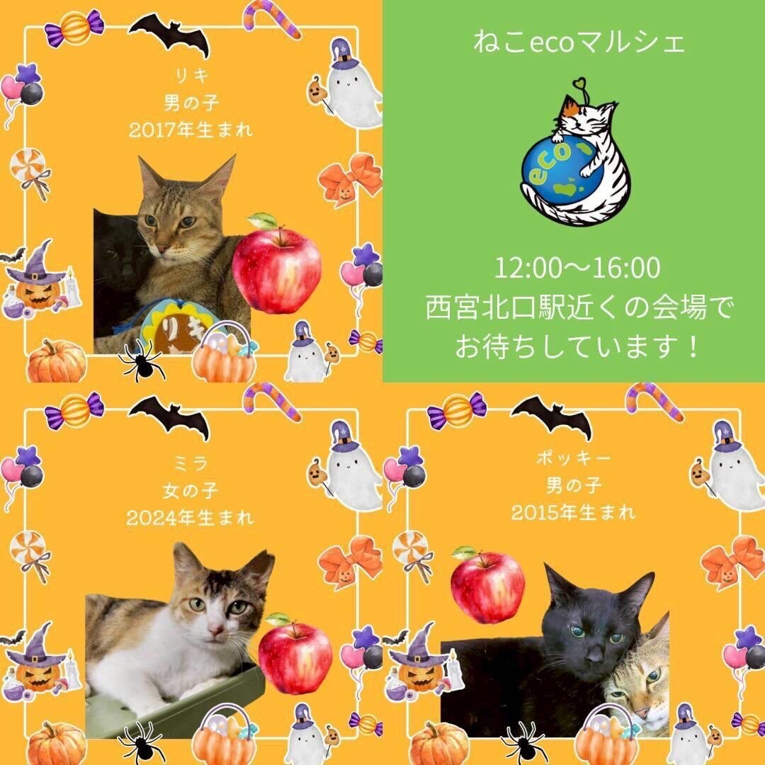 今週末10/19(日)は🍀ねこecoマルシェ in西宮北口🍀😸 譲渡会では 総勢35頭の猫たちが参加します❤️ ねこグッズやヴィーガンパンも販売しています🍞 是非お越し下さい😸 neko-satooya.com #保護猫 #子猫 #譲渡会 #西宮 #ねこecoマルシェ #60家 pic.x.com/dNbtrGPkwN
