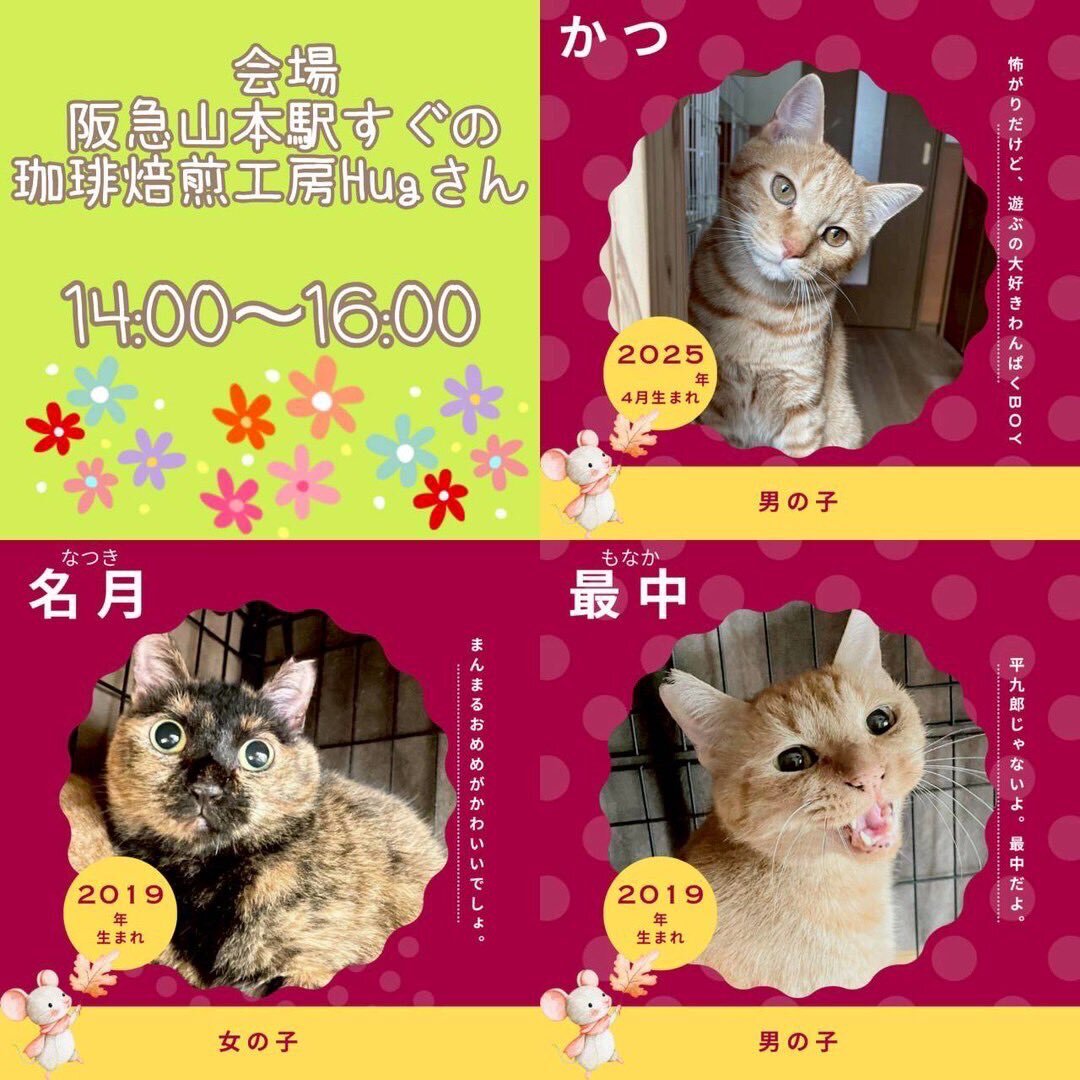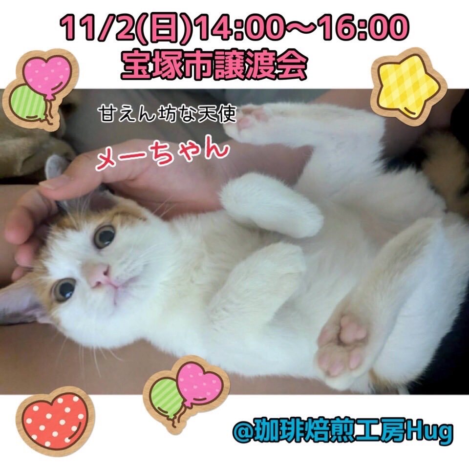 明日11/2(日)は🍀宝塚市譲渡会 in 珈琲焙煎工房Hug☕️😺 写真で参加猫のご紹介✨ 譲渡会では総勢26匹の猫達が参加します😸 初参加の子猫たちも❤️ 猫を飼うのは初めてで色々心配❗️という方も、何でもご相談下さい✨ 是非お越し下さい😸 neko-satooya.com #保護猫 #譲渡会 #宝塚 #60家 pic.x.com/YOLfic28Bh