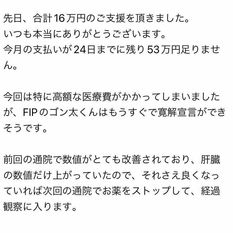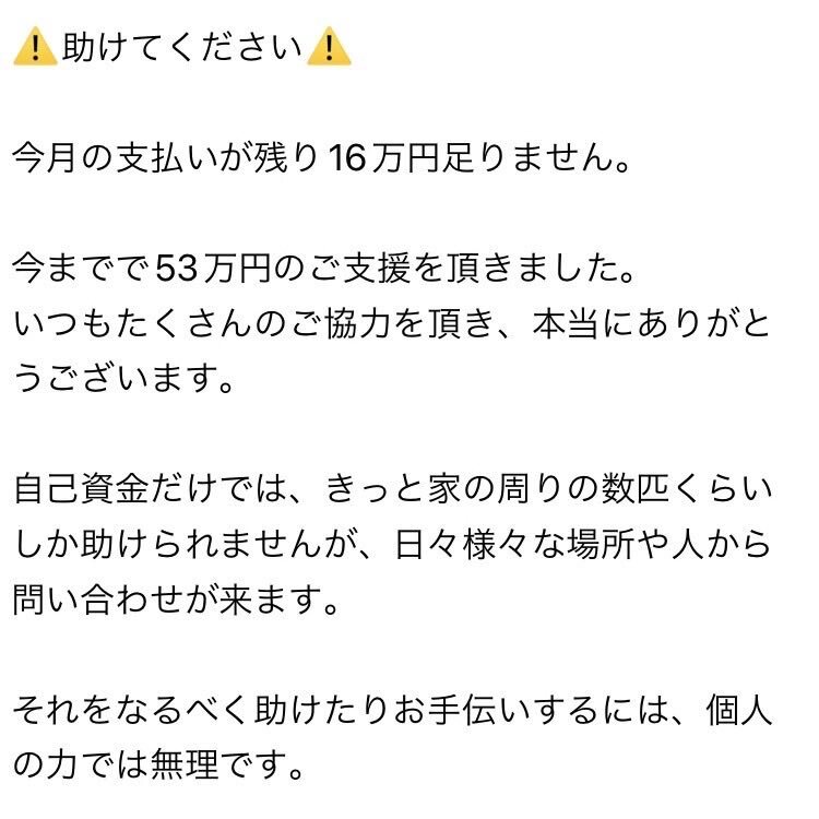 緊急ご支援のお願い 先日、合計16万円のご支援を頂きました。 いつも本当にありがとうございます🙇♂️ 今月の支払いが24日までに残り53万円足りません。 どうかできる範囲でご協力のほどお願いいたします🙇♂️ #保護猫 #60家 pic.x.com/LlrVVt5lMJ