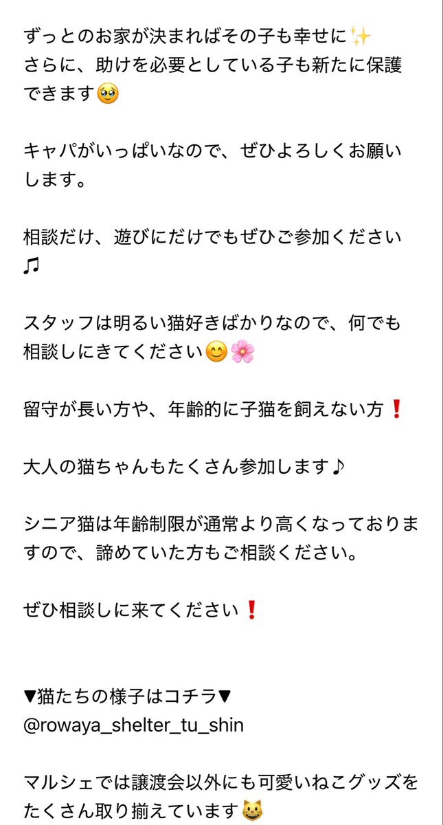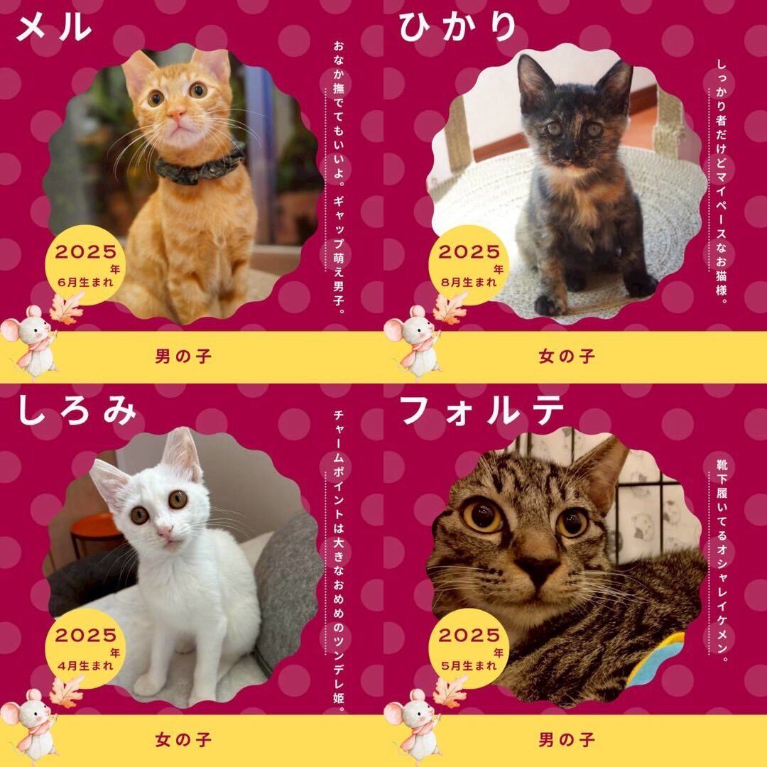 明日11/16(日)は🍀ねこecoマルシェ in西宮北口🍀😸✨✨🍀 写真で参加猫のご紹介です♪ 譲渡会では 総勢30頭の猫たちが参加します❤️ 相談だけ、遊びにだけでもぜひご参加ください♫😸 neko-satooya.com #保護猫 #子猫 #譲渡会 #西宮 #ねこecoマルシェ #猫グッズ #ヴィーガン #60家 pic.x.com/9LFrEFHjwo