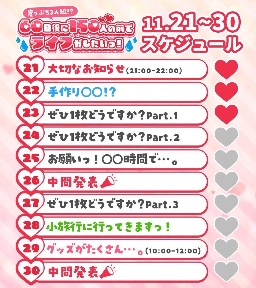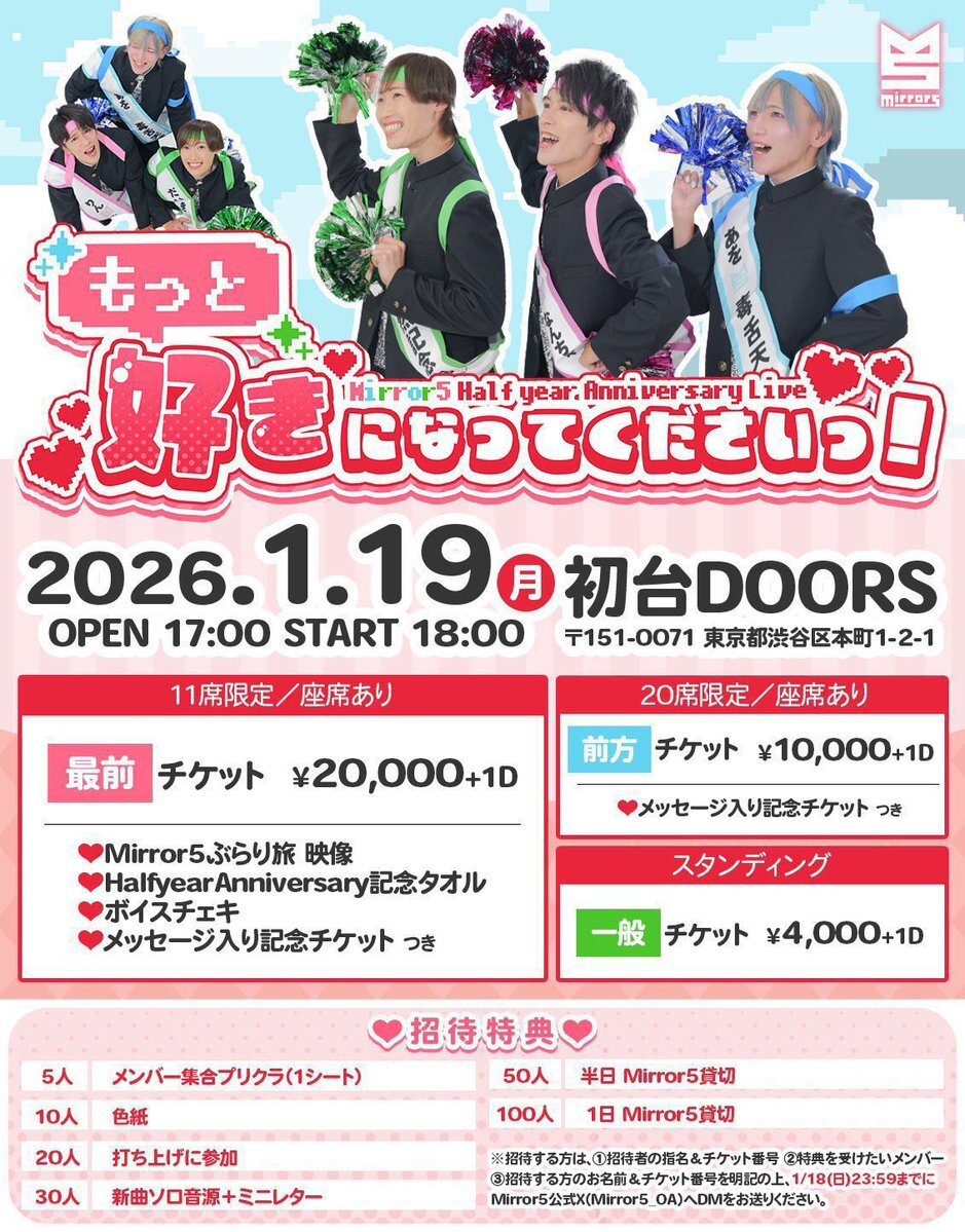1/19(月)『Mirror5 2nd Anniversary Live〜もっと好きになってくださいっ!〜』 【会場】初台DOORS 【料金】 最前チケット20000円 (残り2枚) 前方チケット 10000円 一般チケット 4000円 【予約】tiget.net/events/441391 #崖っぷち3人組 #60日後に150人の前でライブがしたいっ #ミラーファイブ pic.x.com/oCY25kvrRh