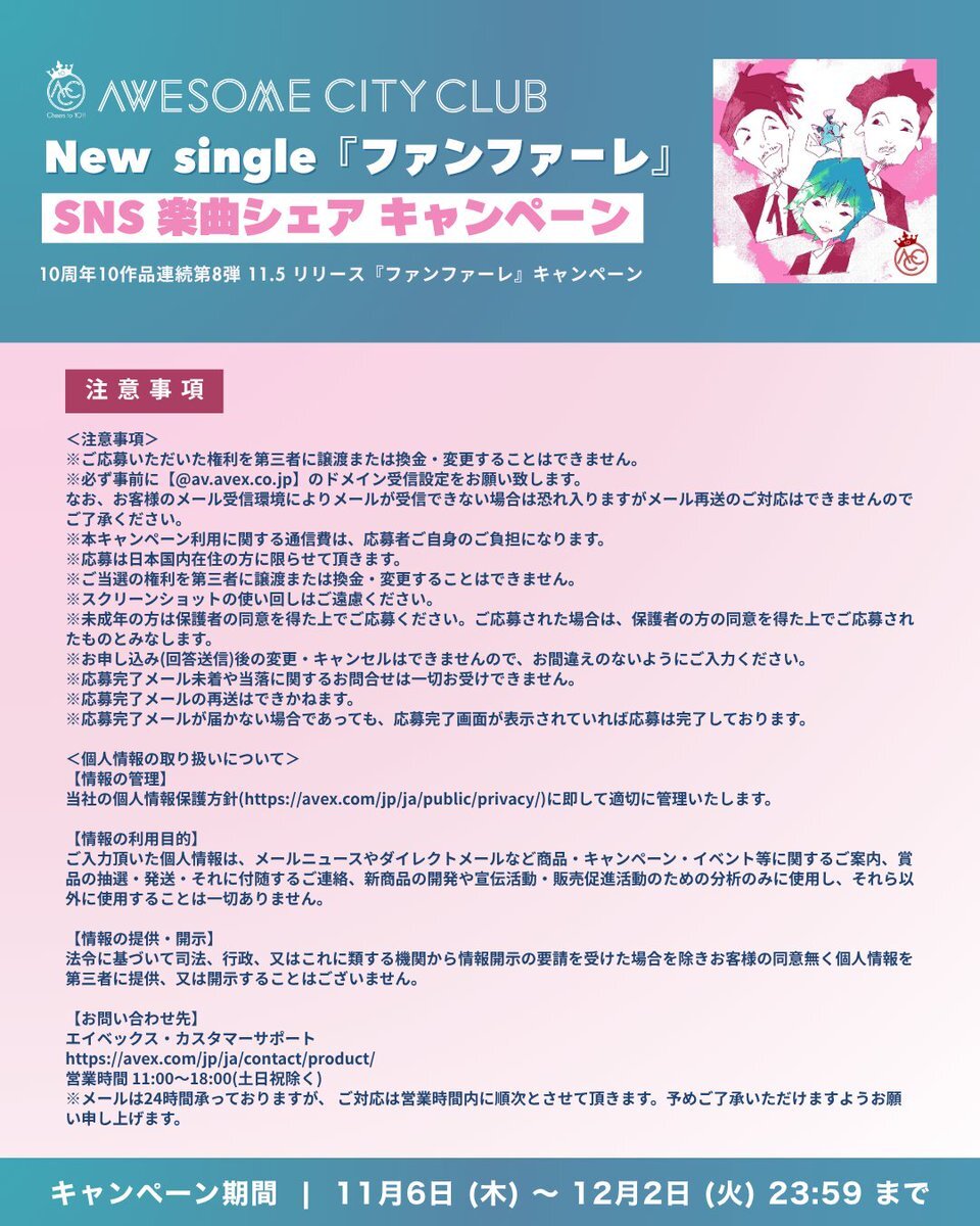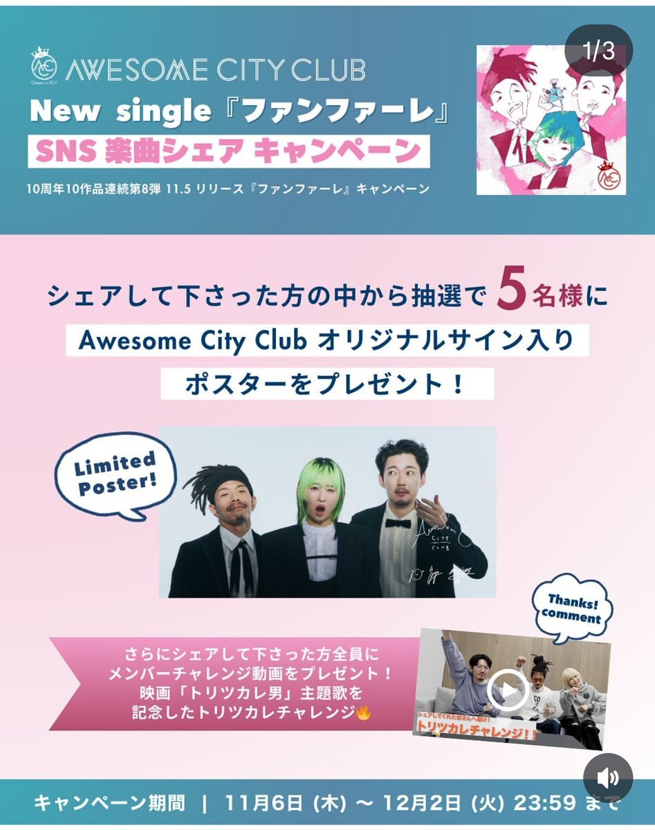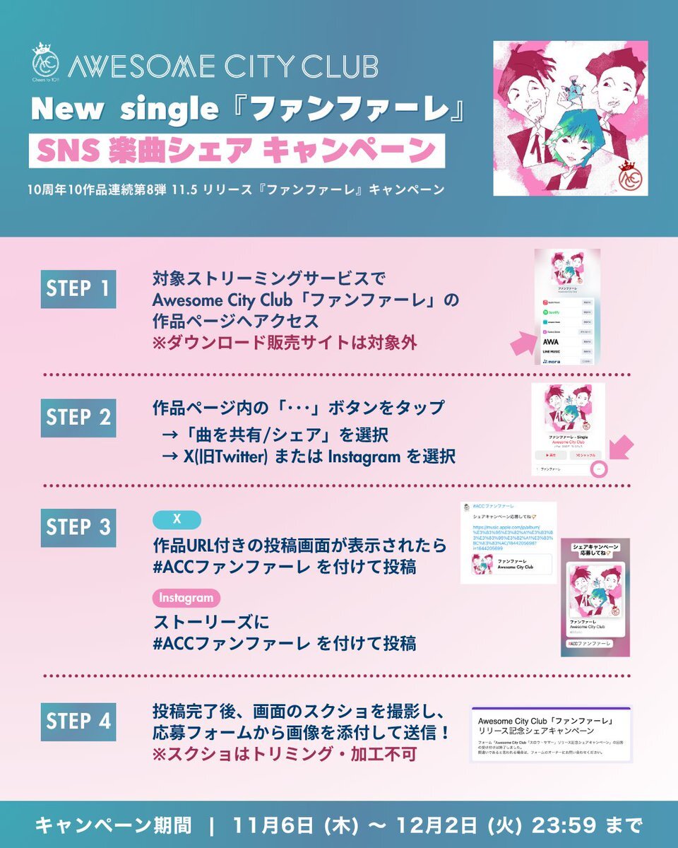 【Share Campaign】 11/5「ファンファーレ」リリースを記念し SNSシェアキャンペーンスタート📯 Awesome City Club 11月5日配信の新曲 「ファンファーレ」を聴いて、XやInstagramで #ACCファンファーレ をつけてシェアして 下さった方の中から抽選で5名様に pic.x.com/Fzk99PN9XI