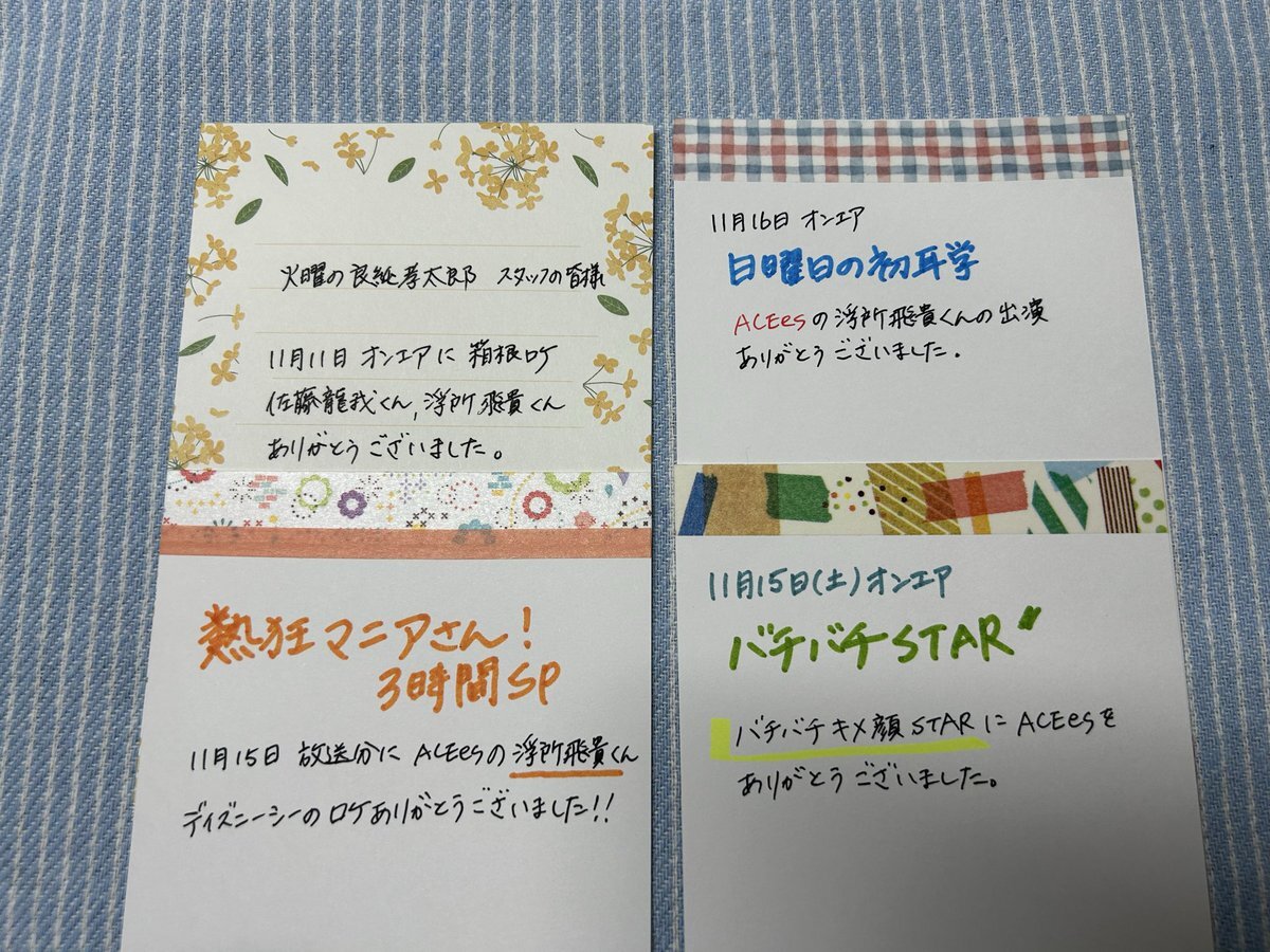 番組のお礼と感想のハガキ書きました💖浮所くん中心です🥰🙏 🧡熱狂マニア 🧡DayDay 🧡初耳学 うきティ🧡💙✨ 🫶バチバチSTAR⭐︎ を投函📮しました〜  TVや雑誌掲載が嬉しくてハガキ送ってるけど この反響を直接ACEesに届けたいー 早く離陸✈️✨💍して、絶対デビューしようね〜💎✨ #ACEesハガキ部 pic.x.com/grYQBdoiKX