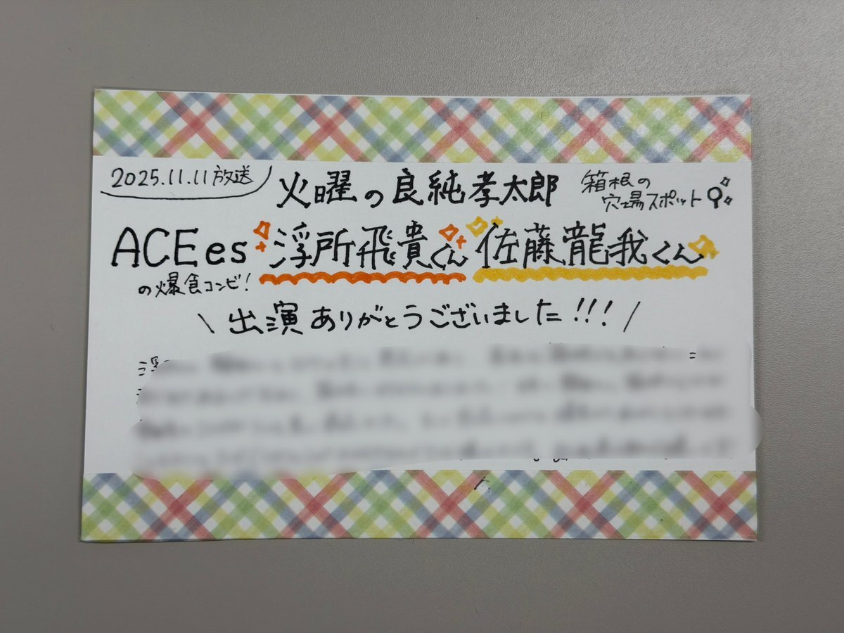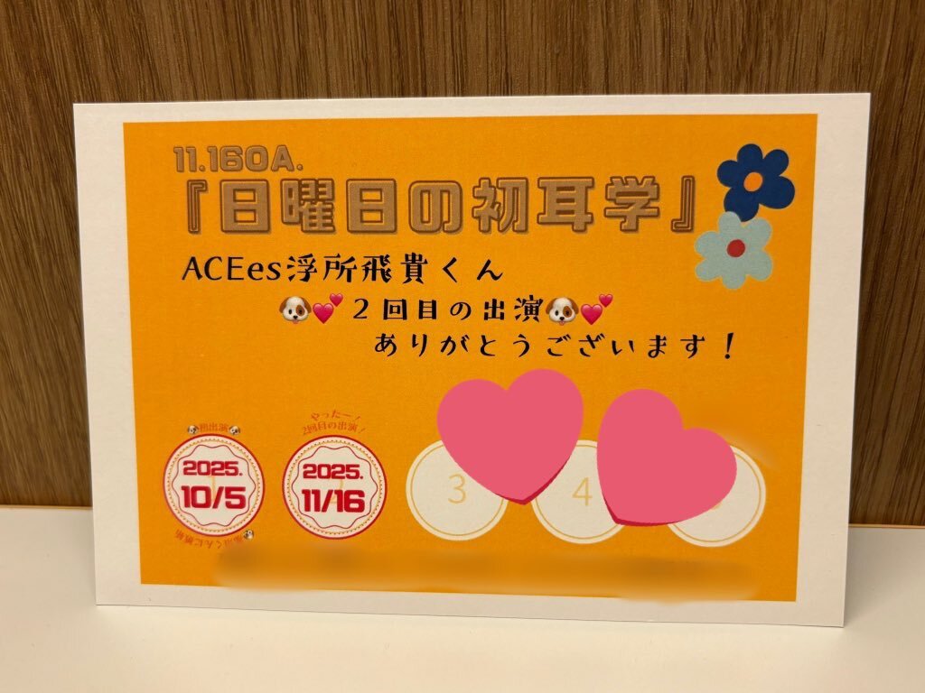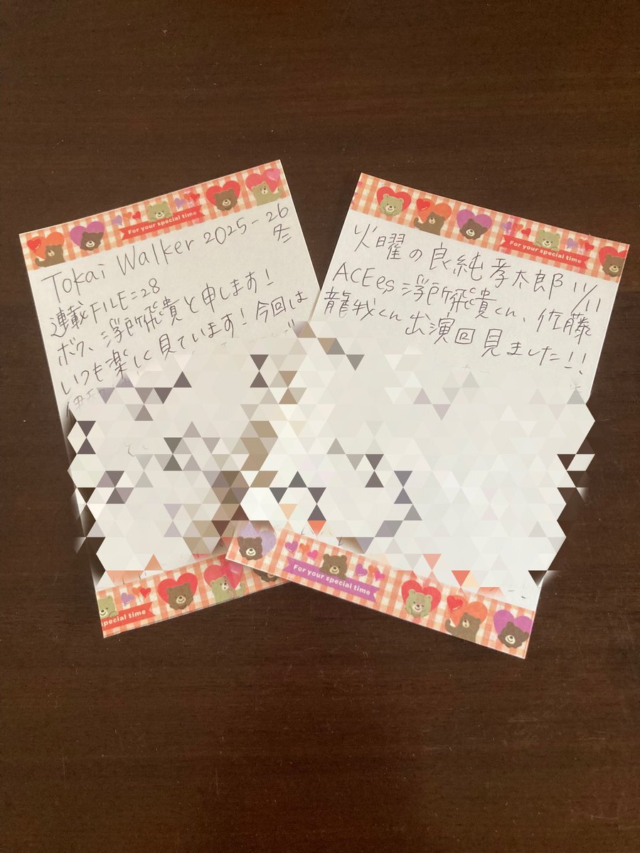 本日、一粒万倍日💍ACEesお礼状を投函📮💌𓂃𓈒𓂂𓏸 これから急遽用事で出かけなきゃなので、書き上げました💌💌 🧡📖Tokai Walker2025~26冬 (連載 ボク、浮所飛貴と申します) 🧡💛📺火曜の良純孝太郎 昨日もめちゃくちゃ楽しかったよーー! #ACEesハガキ部 pic.x.com/GxpXRCYkgz