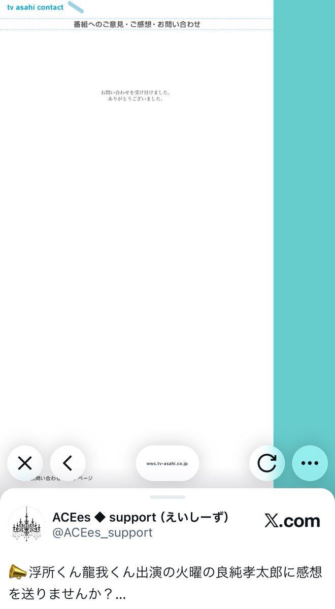 📣浮所くん龍我くん出演の火曜の良純孝太郎に感想を送りませんか? 🔻 テレ朝 wws.tv-asahi.co.jp/contact_to/ind… 💌〒106-8001 テレビ朝日 「火曜の良純孝太郎」ご担当者様 ACEesのペアをたくさん取り上げてくださってるのでお礼も伝えていきましょう! #ACEesハガキ部 x.com/acees_support/…