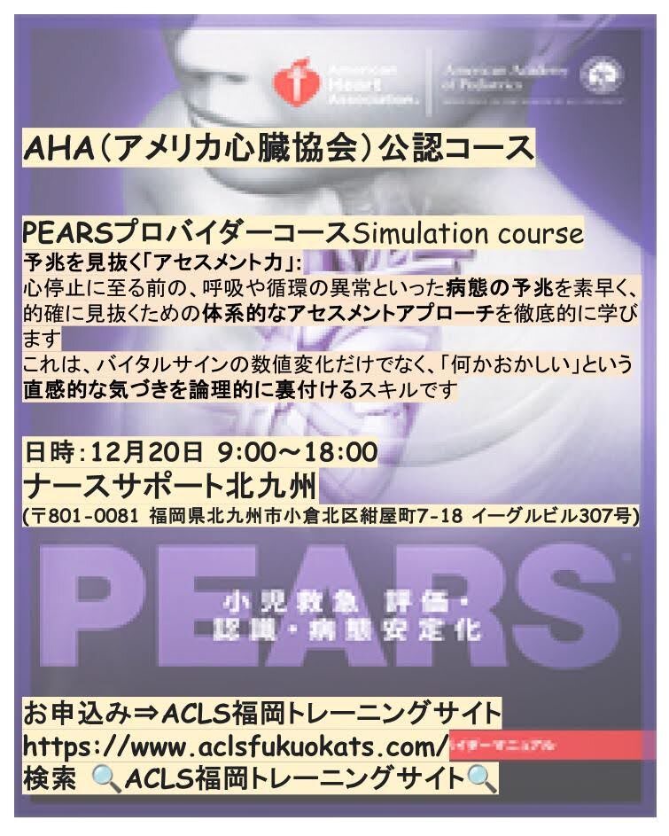 🚨PEARS®で心停止を未然に防ぐ!「急変させない」緊急度判断と迅速な初期介入スキルを習得。 📅 12/20開催! 📍会場:ナースサポート北九州 (主催:ACLS福岡トレーニングサイト) 申込みはこちら🔽 🔗aclsfukuokats.com #PEARS #急変対応 #看護師 #医療従事者