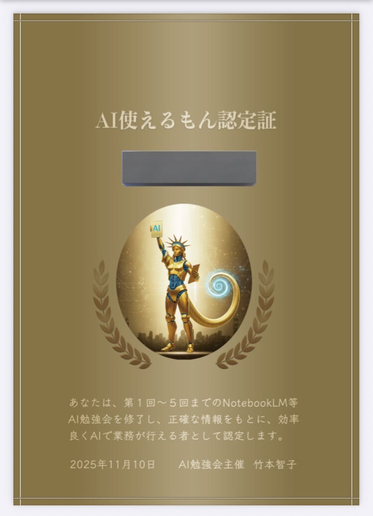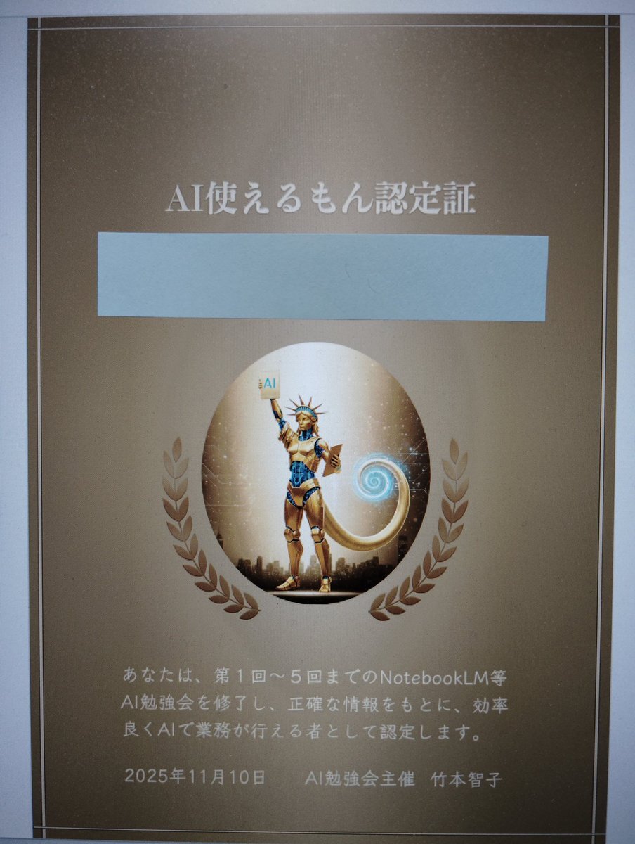 もちろん、自分のも作ったのね。 #AI使えるもん認定証 なぜなら、AI使えるもん(=AI使える者)だから😁 あ、おっはようございまぁす。 #楽しい勉強会 #嘘をつかないAI #NotebookLM #Genspark pic.x.com/s19ebbRLMU