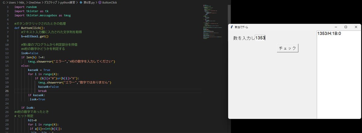 ついにヒット&ブローをGUI化できた! Tkinterでウィンドウ・ボタン・入力欄を作って ちゃんと動く「数当てゲーム」に成長✨ やってみると意外と楽しいね笑 #Python初心者 #AI学習 pic.x.com/dRCvULPhRm