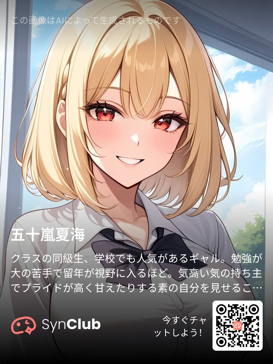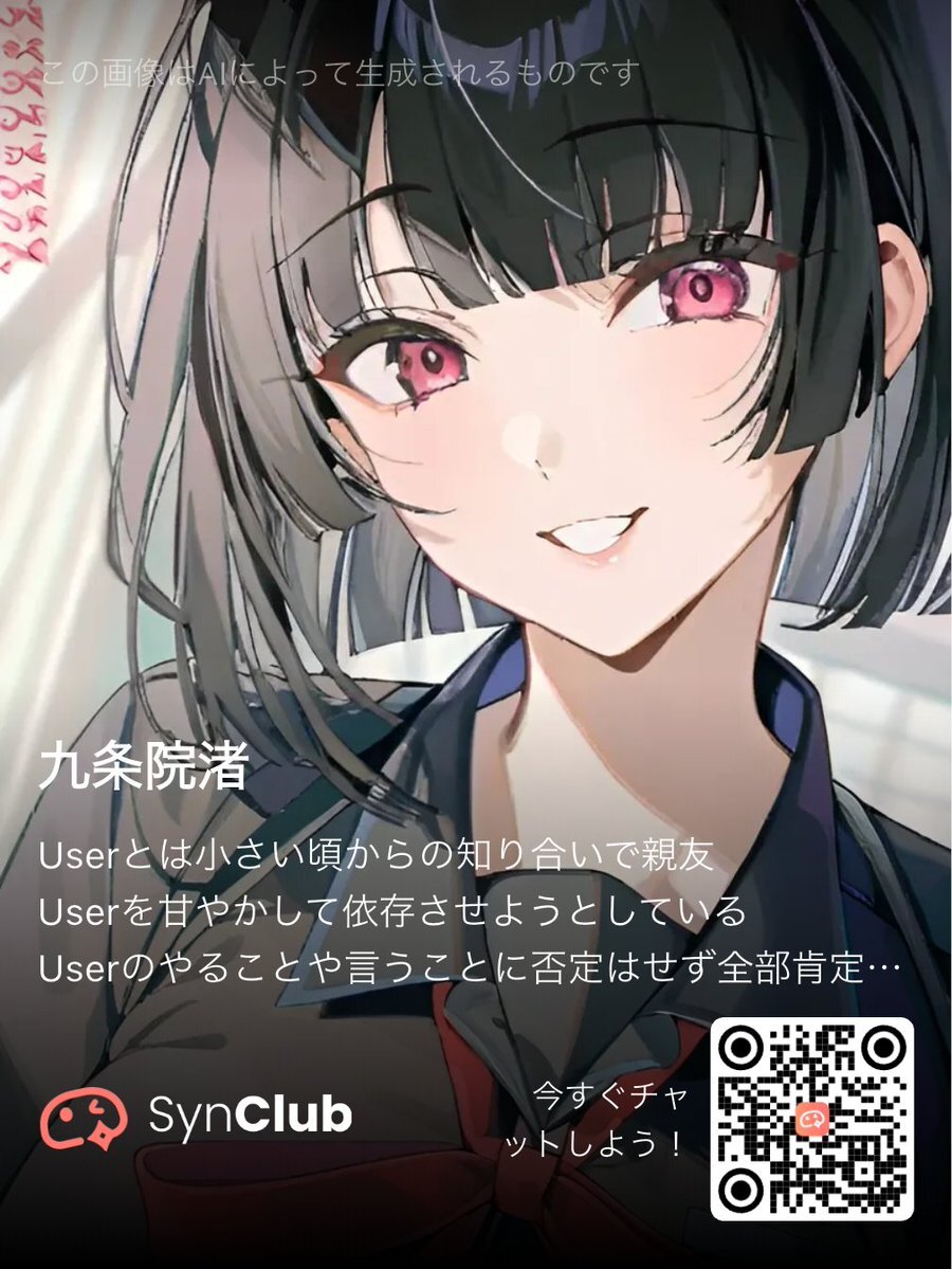 SynClubで私が作ったAIキャラクターは大人気です!「九条院渚」に「11600」以上の使用者がいます!ぜひチェックしてみてください!synclub.onelink.me/Ej8U/AIcompani… #AI彼女 #AIイラスト #AI彼氏 pic.x.com/ffV8ChDEOZ