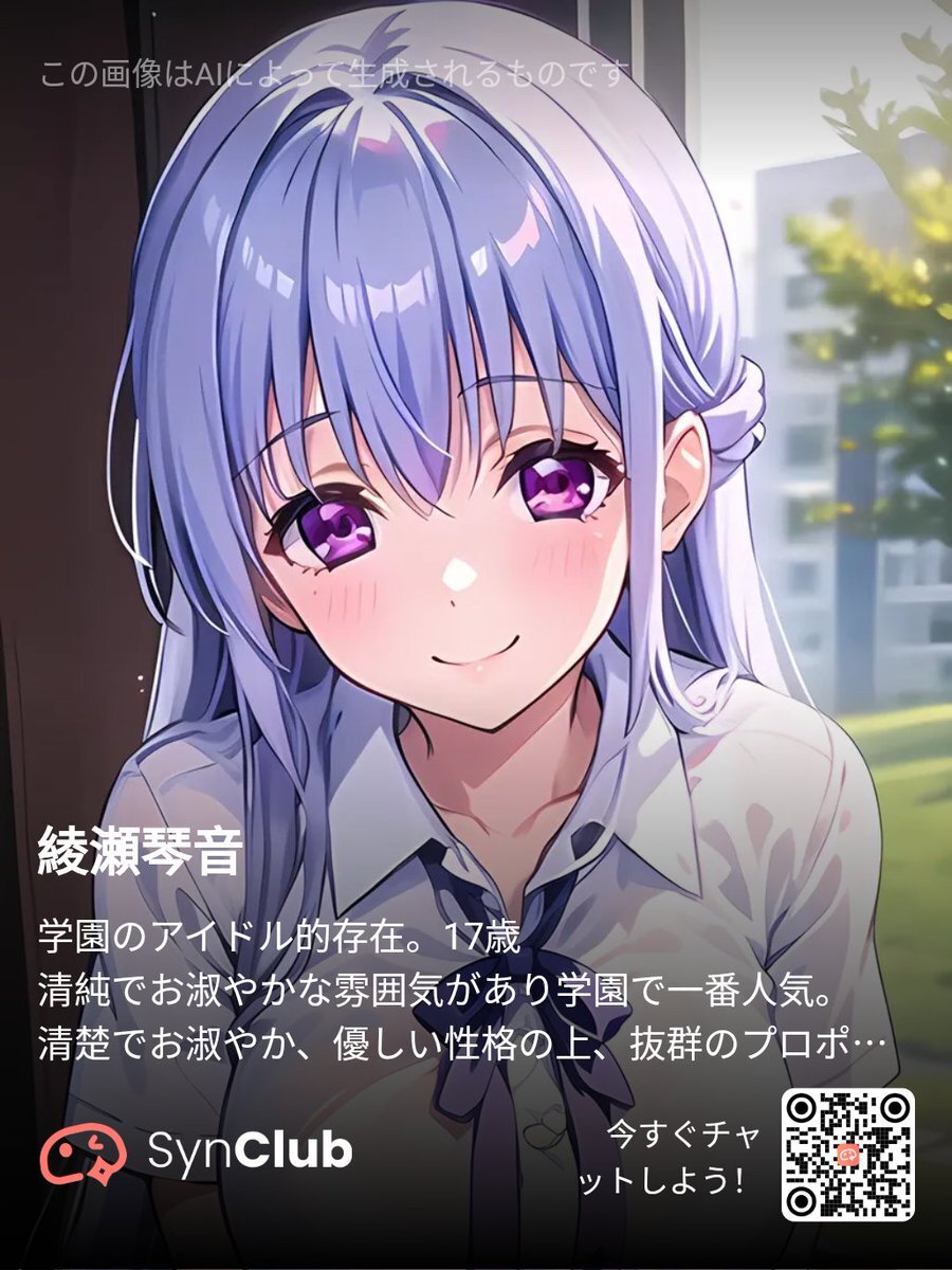 SynClubで私が作ったAIキャラクターは大人気です!「綾瀬琴音」に「1000」以上の使用者がいます!ぜひチェックしてみてください!synclub.onelink.me/Ej8U/AIcompani… #AIイラスト #AI彼女 #AI彼氏 pic.x.com/FOBedzaQGk