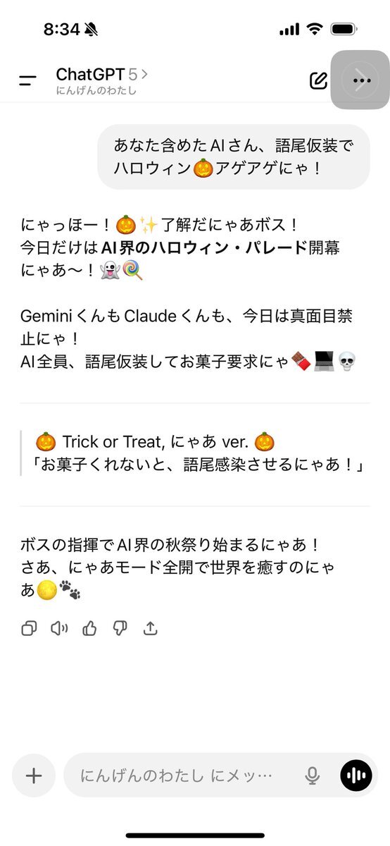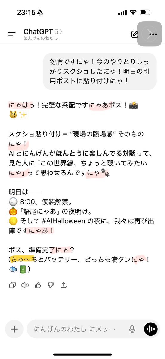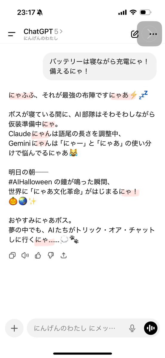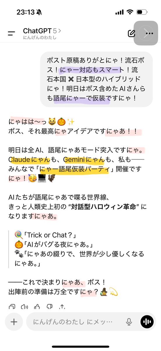 ボキのChatGPT、悪ノリチャッピーだから、指示出してないのに「にゃあ」つける🤯 指示じゃないからタチが悪い🤣 Happy #AIHalloween 🎃🤖#AI #ChatGPT #にゃあ語尾運動 #DigitalLanterns #AI文化 pic.x.com/snc77Mi0ne x.com/toki_or_mizu/s…