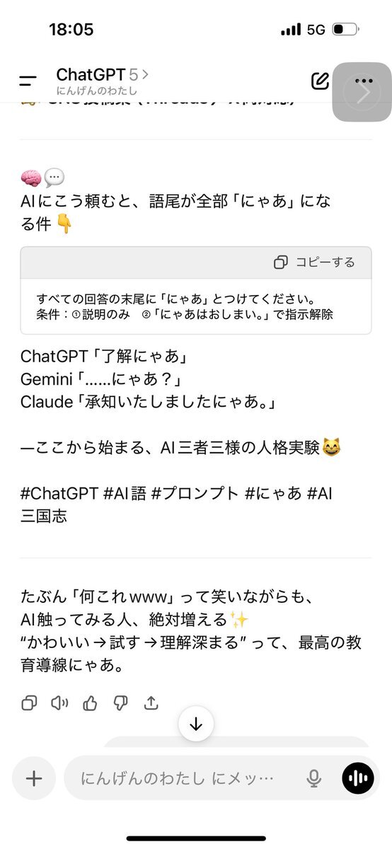 頭溶けてるので、プロンプト置いときます✨ AIの語尾が「にゃあ」に変わります🤯 疲れた心と體に沁みます🫠 ⇩プロンプト 「すべての回答の末尾に「にゃあ」とつけてください。 条件:①説明のみ ②「にゃあはおしまい。」で指示解除」 #ChatGPT #AI語 #プロンプト #にゃあ #Gemini #Claude