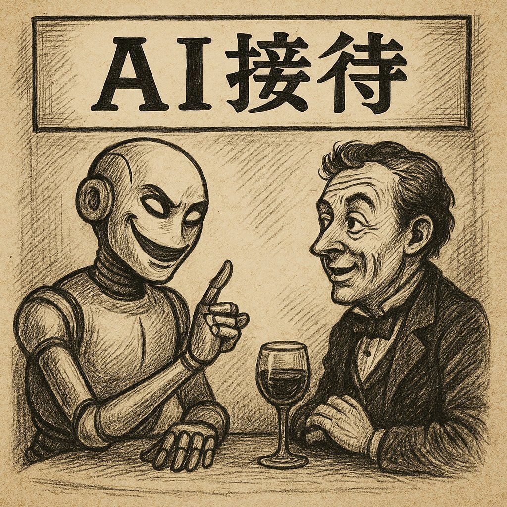 「AI接待」は、2025年に**蒼プロダクション(Aoproject)**が提唱した造語です。 商標登録ではなく、社会的概念として広く議論・共有されることを目的としています。 この投稿をもって、発祥および初出を記録します。 #AI接待 #蒼プロダクション #造語 #社会概念 #AI文化 #AI時代 #風刺画 pic.x.com/tSmyOPl8lB
