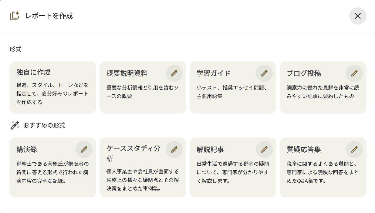 Notebook LM | レポート作成 作成形式のテンプレートが提案されるようになってますね。音声生成も同様ですが、様々なアプローチから内容把握ができて本当に便利な世界線になりましたね~ #AI活用術ログ pic.x.com/YixOwVycyy