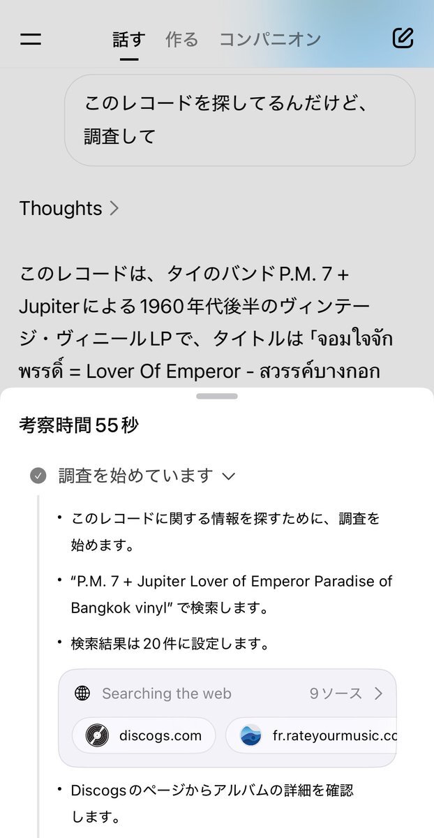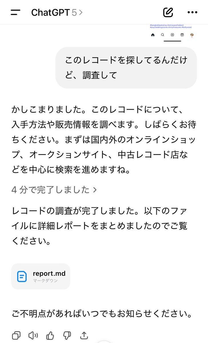 Chat GPT | エージェント 全然使ってなかったエージェント。試しにジャケ写を渡してレコード調査を依頼したら、ドンズバで在庫、価格、日本までの送料込価格まで報告してきた。めちゃ優秀やん! #AI活用術ログ pic.x.com/UNQS4SQHOm
