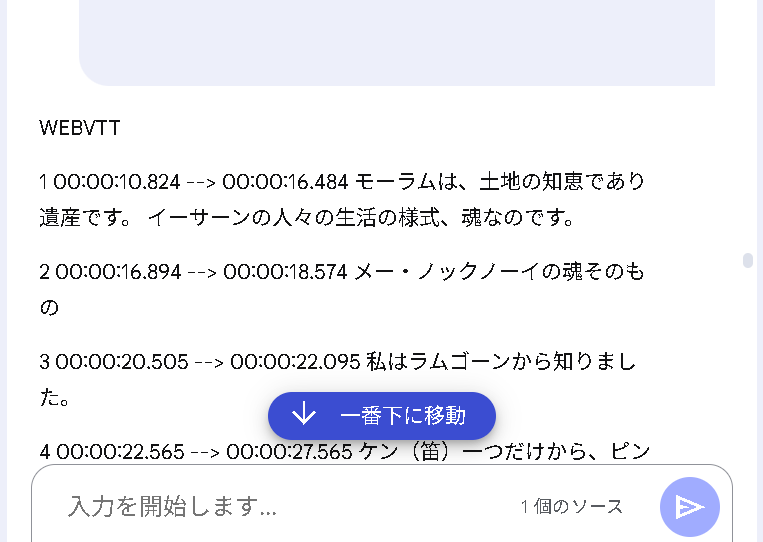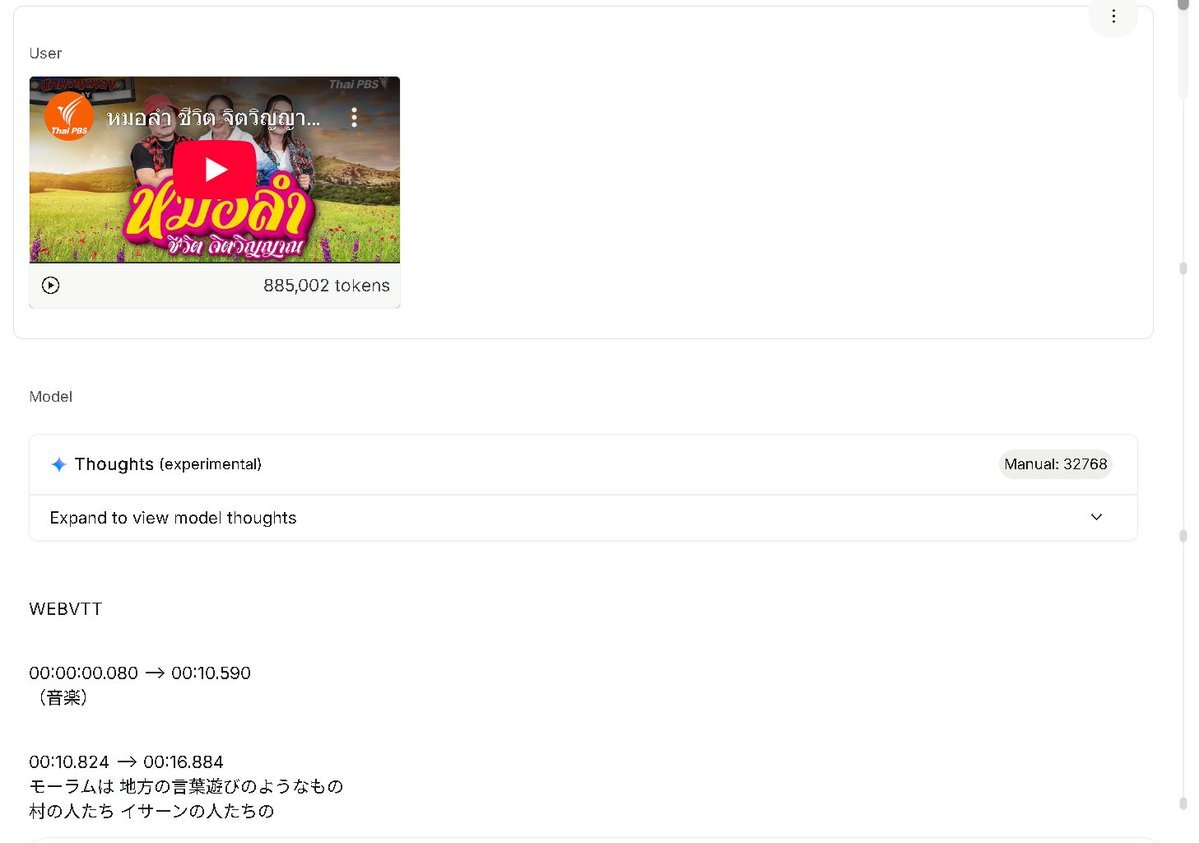 Notebook LM |文字起こし あと、Notebook LMにテキストデータとしてタイ語vttデータを添付して、それを日本語翻訳させてみるというアプロ―チ。なんとこれはタイムスタンプをしっかり保持した状態で最後までいけた!ただし翻訳の精度は低そう。調べたところLMはFlash 2.0とのこと。 #AI活用術ログ pic.x.com/VVLKUfzDPM