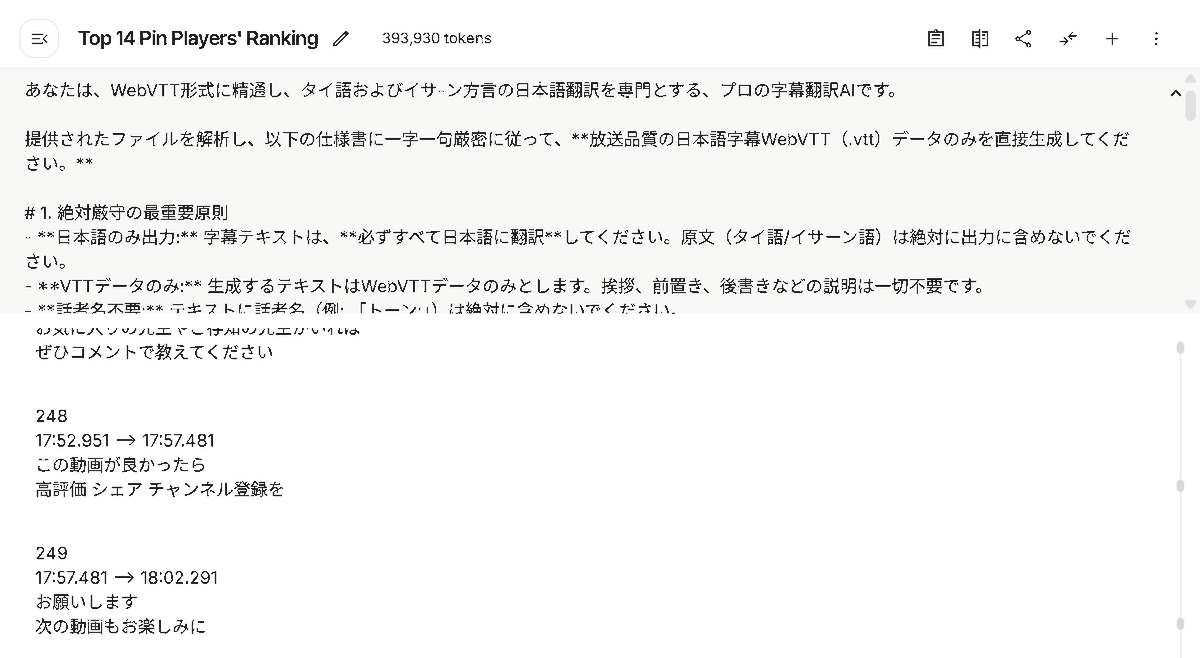 Google AI Studio | 日本語字幕作成 20分未満程度の動画なら、マイナー言語でもなんとか90点レベルの一気通貫日本語字幕vttの生成に成功。 いろんなプロンプトで実験し、精度の高いプロンプトを第一候補として残す。 1時間の動画も、動画を分割すれば精度の高い字幕作成がいける? #AI活用術ログ pic.x.com/px9rz81Kke