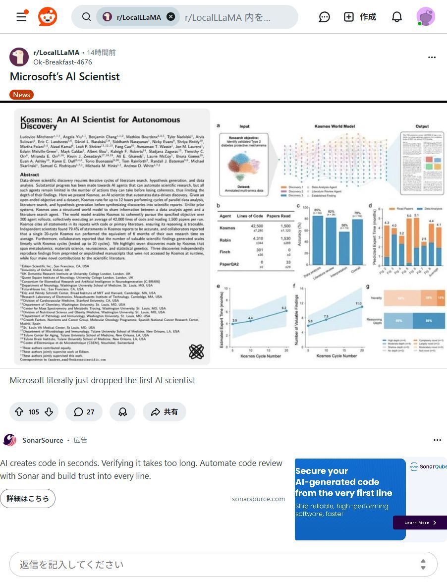Microsoftが「AI科学者Kosmos」を爆誕!🚀 人間6ヶ月分の研究をAIが自律遂行!論文読み込みから実験・分析まで全自動で驚きです!生産性爆上げ間違いなし✨ #AI研究 #生産性向上 pic.x.com/5p7LwYq1OJ
