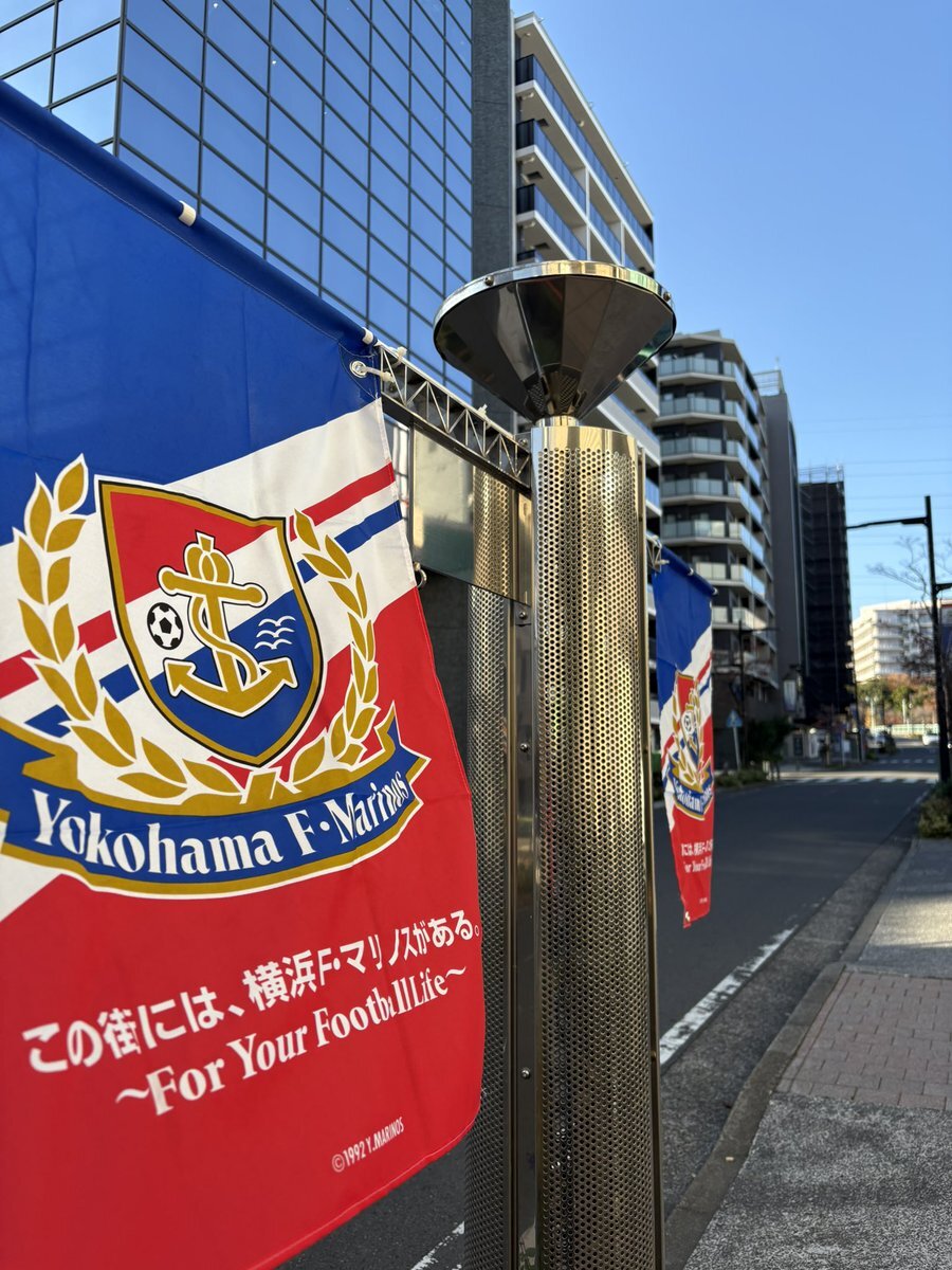 / 目指せ来場者5万人🔥 #ALLFORTRICOLORE プロジェクト⚓️ \ 11/30(日)ホーム最終戦に向けて F・マリノス通りに 「この街には、横浜F・マリノスがある」 フラッグを掲出🔴⚪️🔵 横浜F・マリノスに関わる すべての人に心からの感謝を。 日産スタジアムでお待ちしています🏟️📣 #fmarinos x.com/prompt_fmarino…