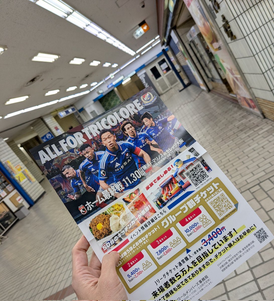 目指せ来場者5万人🔥 #ALLFORTRICOLORE プロジェクト⚓️ 今日は桜木町駅でのチラシ配布に参加しました! いよいよ今週末11/30(日)はホーム最終戦です⚽️ ぜひ日産スタジアムにお越しください✨ pic.x.com/6dpqFofXIa