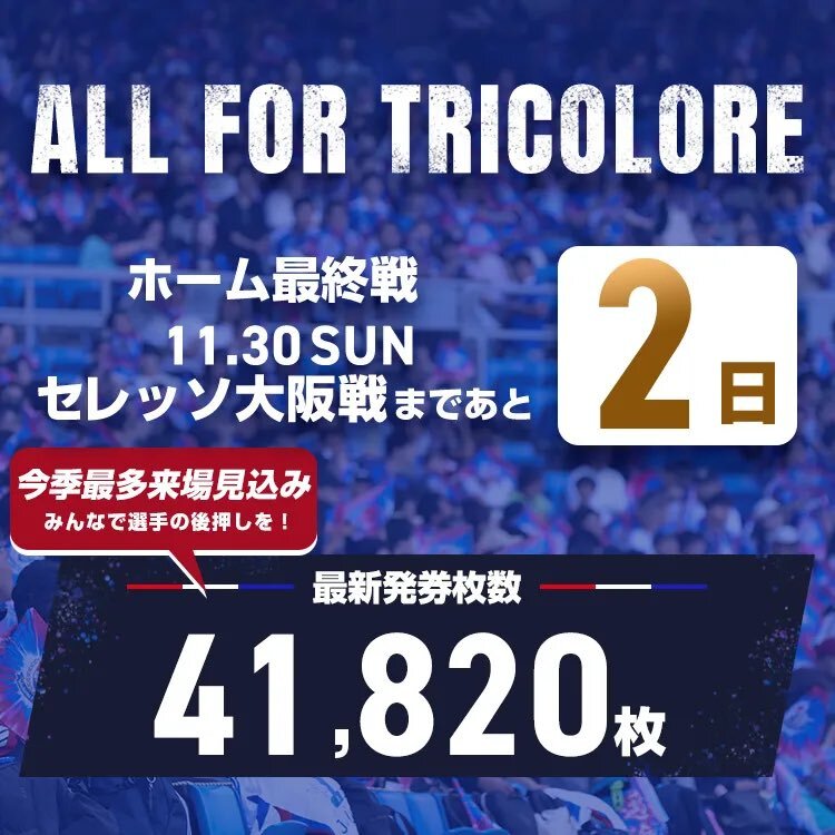 #ALLFORTRICOLORE プロジェクト⚓️ 11/30のホーム最終戦まで残り2日💥 現在の発券数は 41,820枚! メインサイド2Fとバックサイド2Fは連席あり✨ 当日は晴れ予報☀️ 11/30(日)は日産スタジアムでお待ちしています⚡️🔗 bit.ly/40rKYs5 #fmarinos