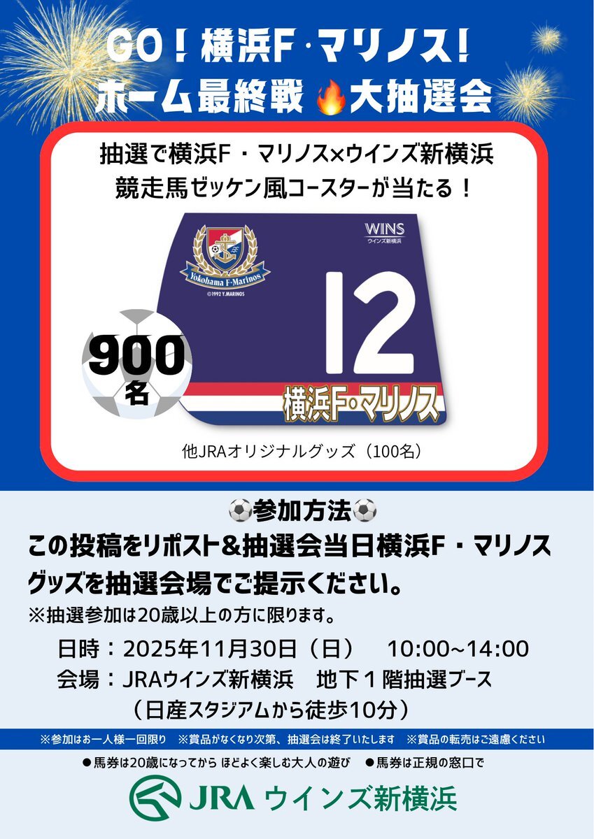/ 横浜F・マリノスコラボグッズが当たる🇫🇷 \ 11/30(日) #ウインズ新横浜 にて抽選会を実施します! 当日はジャパンカップ(G1)も開催🏇 試合前にぜひお立ち寄りください! 🔽参加方法 1️⃣この投稿をリポスト🔁 2️⃣抽選会場でリポスト画面&横浜F・マリノスグッズを提示 #fmarinos #ALLFORTRICOLORE pic.x.com/zNFydAuRGn