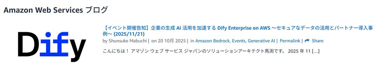 この記事のリンク、まだ切れたままです。 #aws #Dify > 【イベント開催告知】企業の生成 AI 活用を加速する Dify Enterprise on AWS 〜セキュアなデータの活用とパートナー導入事例〜 (2025/11/21) pic.x.com/gk6BdmbZwl