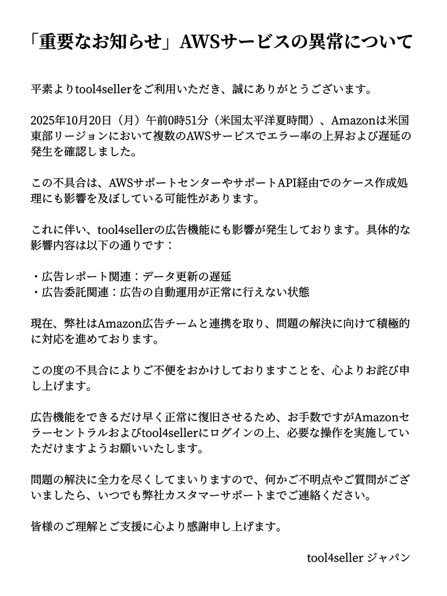 📢【重要】tool4sellerユーザーの皆様へ ・10/20・ 米東部リージョンのAWS障害により、広告レポート遅延・広告委託停止・注文処理やセラーセントラルログインにも影響が出ています。 現在Amazonチームと連携し復旧対応中です。 ご不便をおかけし申し訳ありません。 #AWS