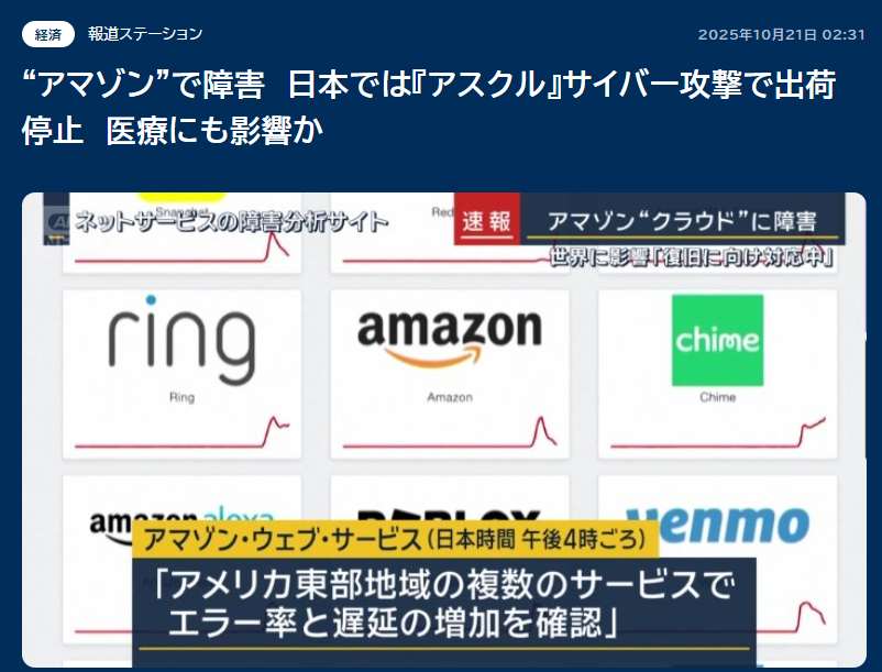 🧩【速報】 アマゾンのクラウド「AWS」で世界的な障害が発生。 米東部の複数地域でエラー率上昇、航空会社やZoom、任天堂などにも影響。一方、日本ではアスクルがランサムウェア攻撃で出荷停止。ロフトや無印良品など委託先企業もEC停止。“サイバー”と“クラウド”の同時脆弱化が現実に。 #AWS障害 pic.x.com/cRpcDIXB6i x.com/shingen1001/st…