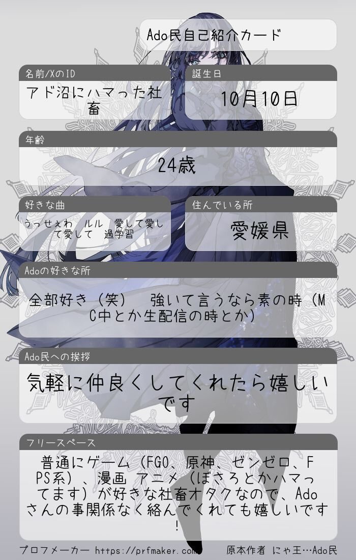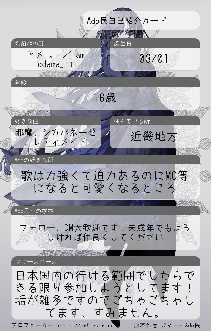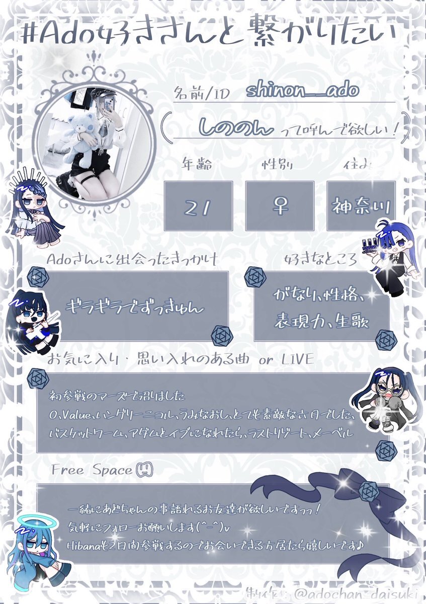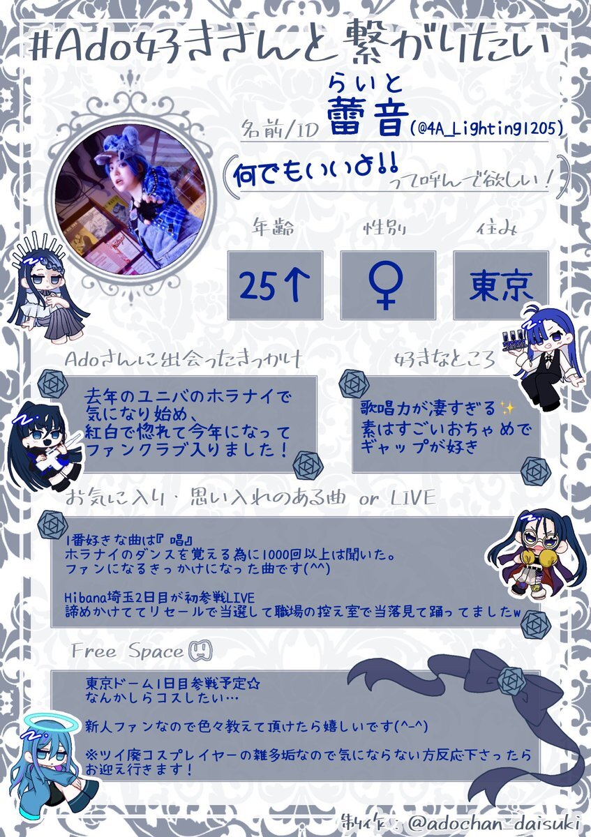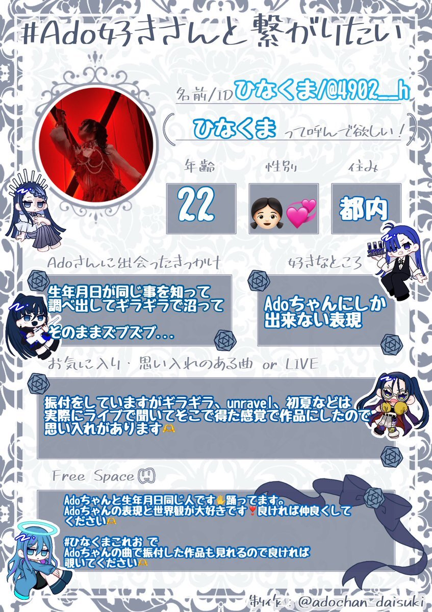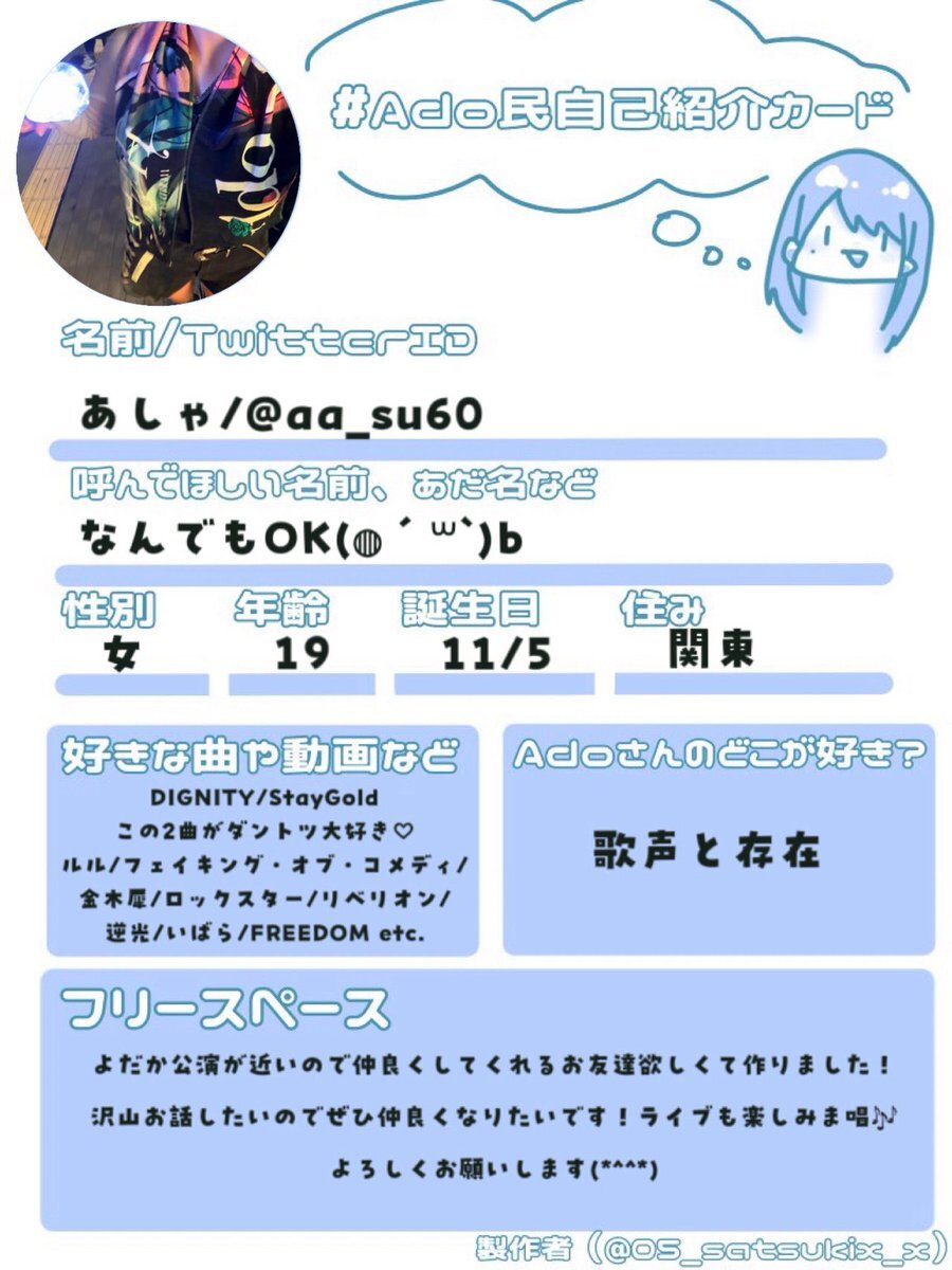 11月22日のよだか京セラに一人で参戦するのでお友達大募集〜🙌🙌 ♡で気になり様お迎え #Ado好きな人と繋がりたい #Ado民自己紹介カード #Ado民さんと繋がりたい pic.x.com/YV6GkT64Jv