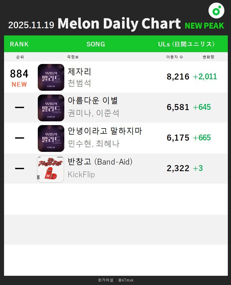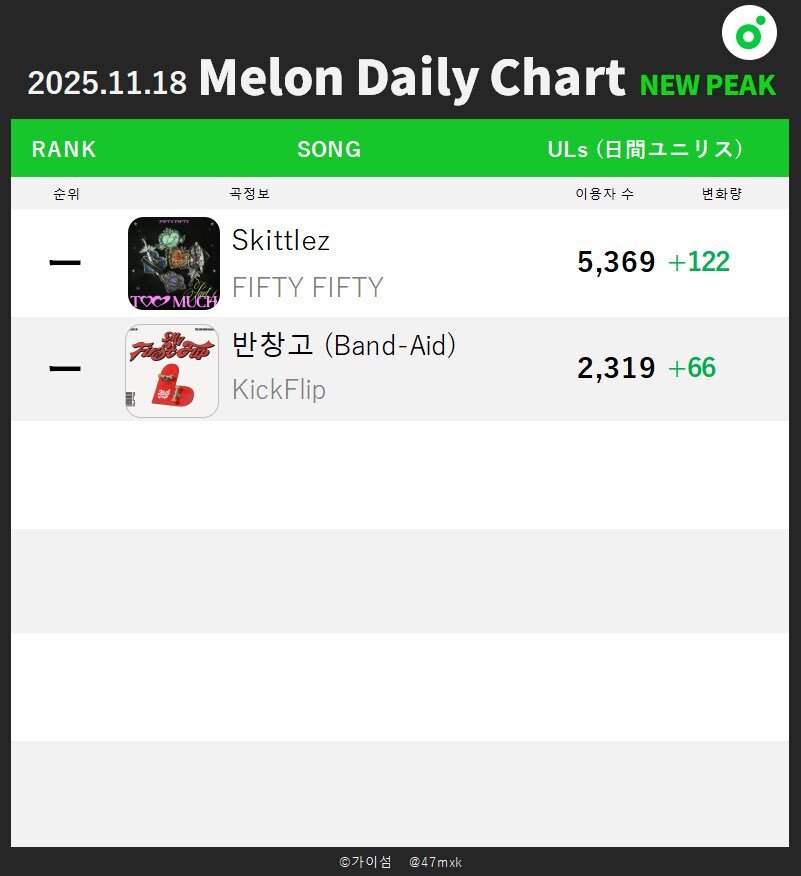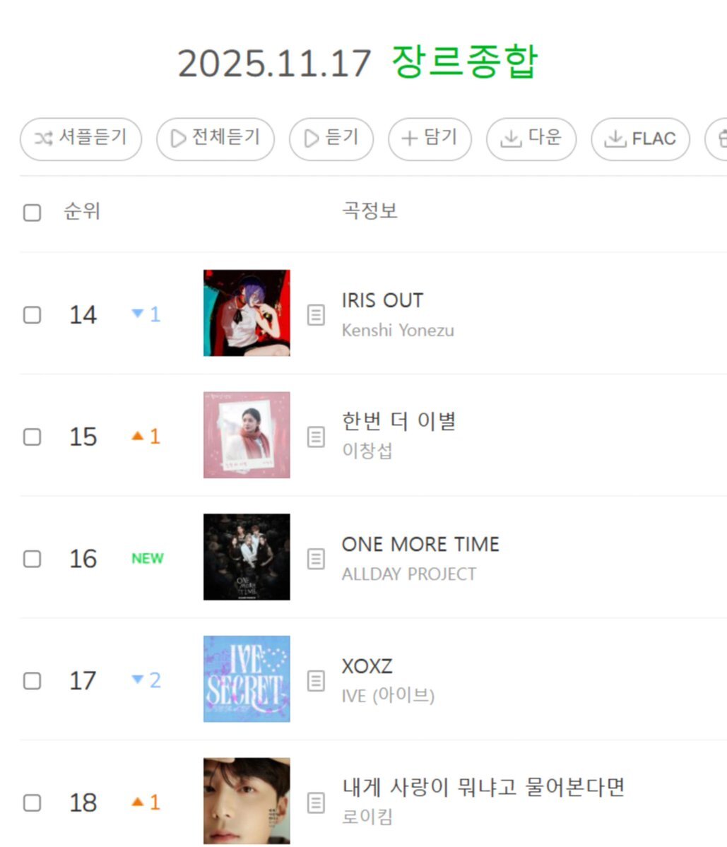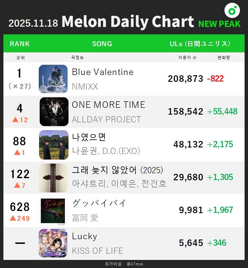 [📈251118 Melon日間ピークまとめ] #NMIXX #KISSOFLIFE #FIFTYFIFTY #KickFlip #ALLDAYPROJECT - ONE MORE TIME オルデプ最新シングルが日間4位に上昇!!日間上位TOP5に第5世代として複数の楽曲の進入に成功したのはQWERに続いて2組目。2025年の達成グルはaespaとALLDAY PROJECTの2組目だけ。 pic.x.com/lQFVW3ktBy