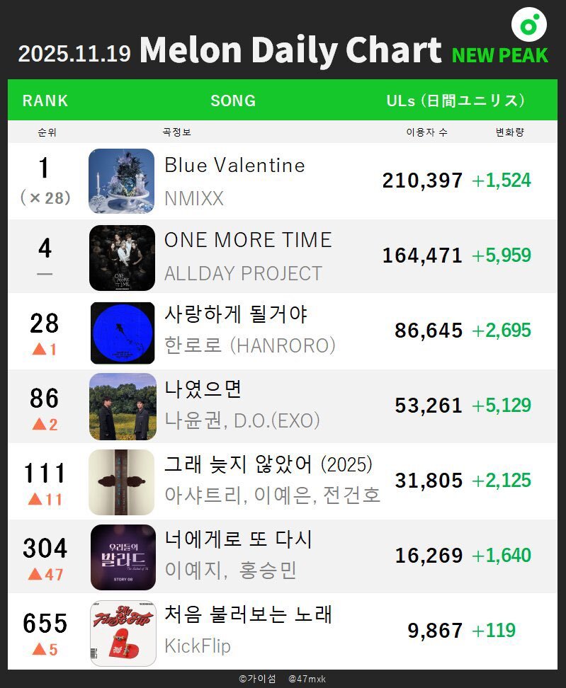 [📈251119 Melon日間ピークまとめ] #ALLDAYPROJECT #KickFlip #NMIXX - Blue Valentine エンミ通算28回目の日間1位を獲得!!これによりDAY6「HAPPY」の27回を上回り、JYP所属アーティストとしてチャート改編後の“日間1位獲得数”最高記録を約1年ぶりに更新。 pic.x.com/ScU9mnSuLz