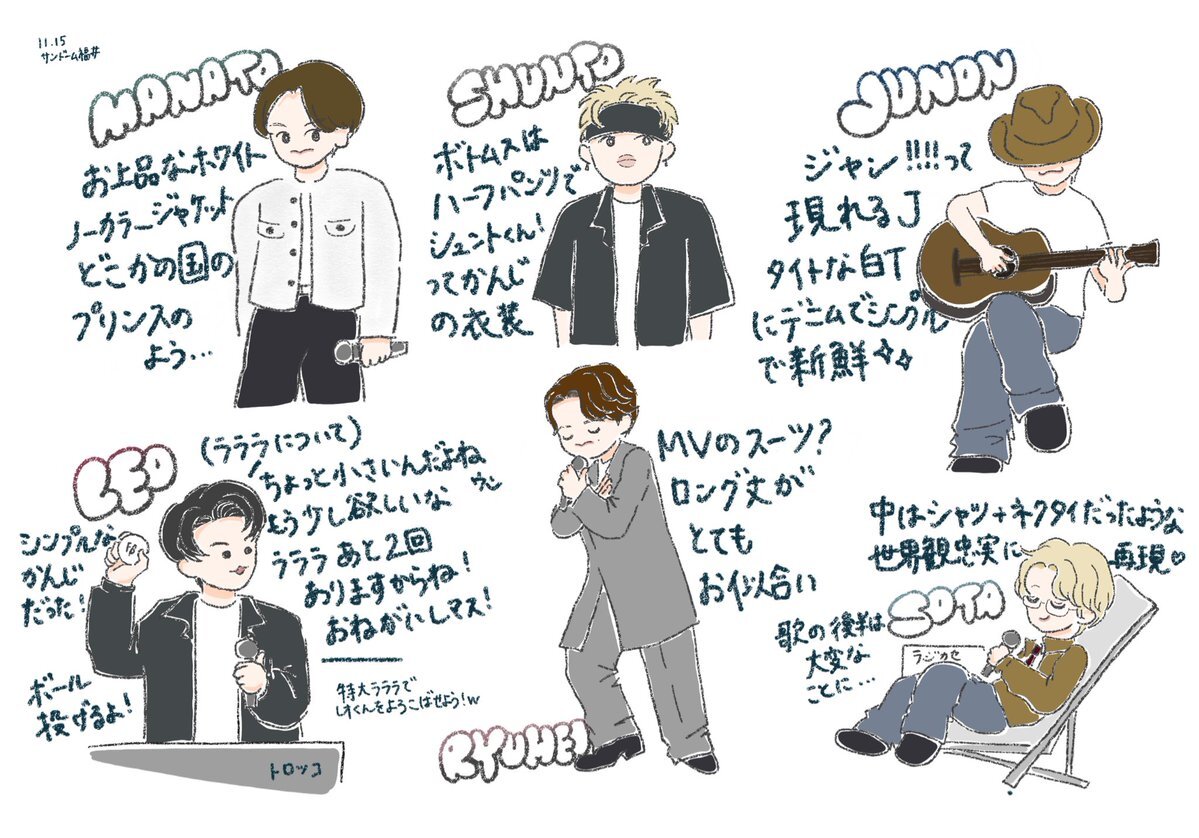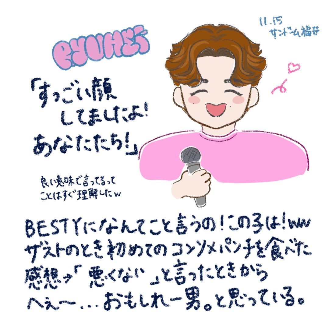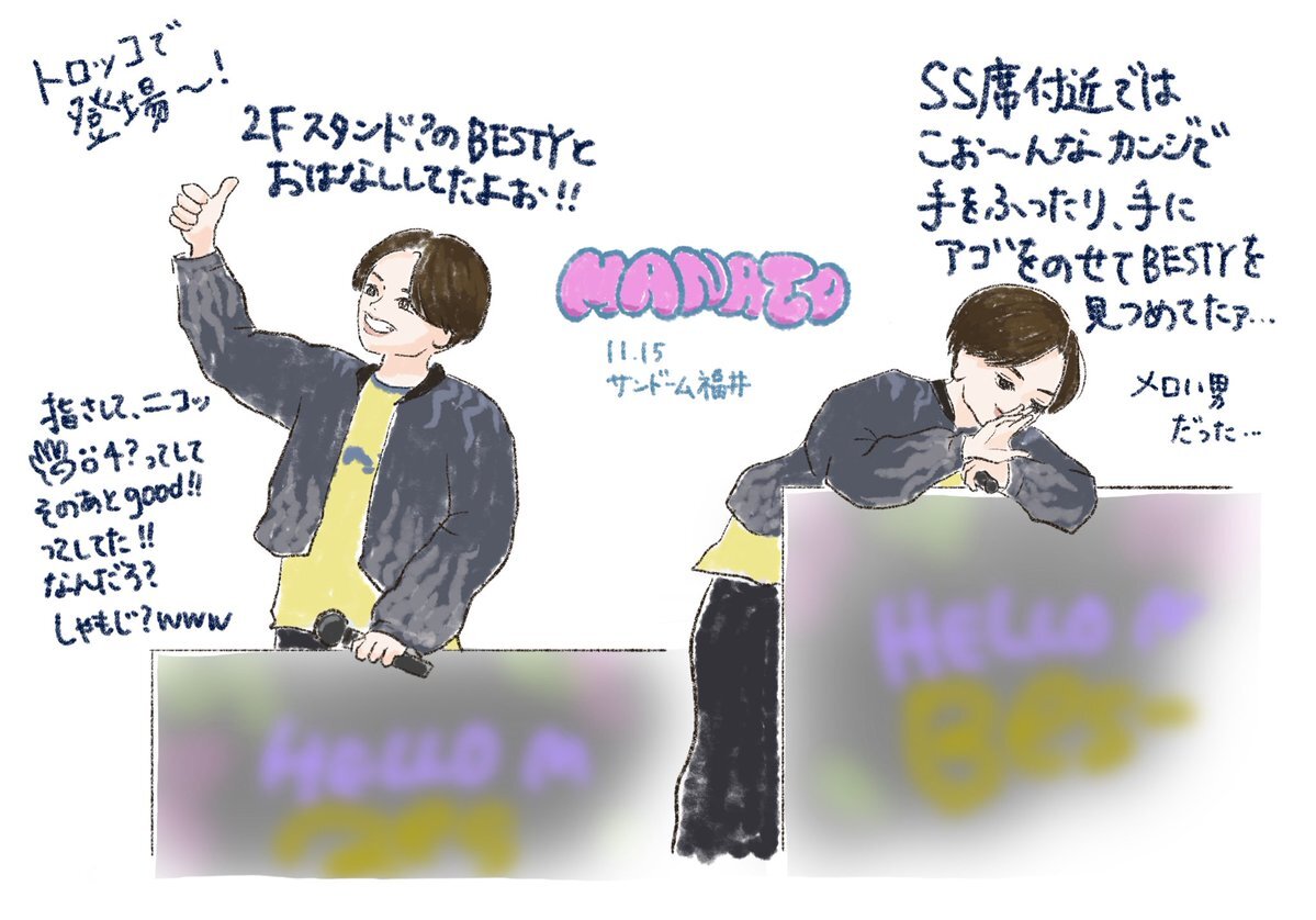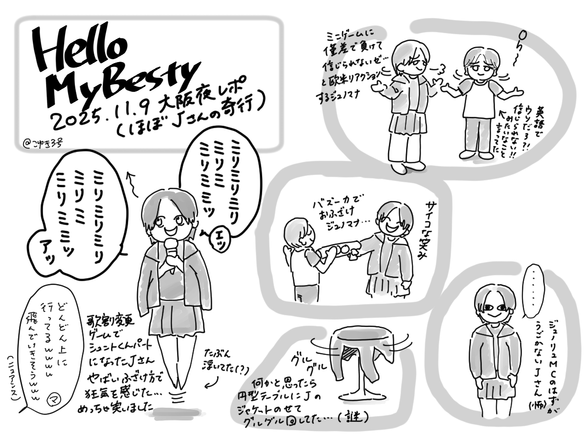 ファンミ大阪11/9夜の部の落書き絵レポ(ほぼJさん、ちょっとジュノマナ)です。ジュノンくんの謎テンション謎行動がすごかったwwww演出ネタバレあるのでご注意ください。 #HelloMyBESTY2 #BEFIRSTファンアート pic.x.com/RVEMDVyhSV