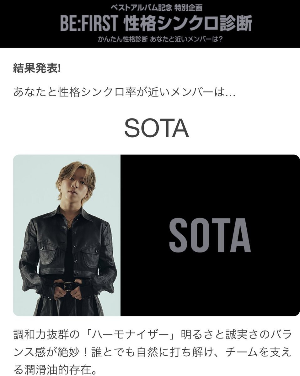 性格シンクロ率が近いメンバーはSOTAさんでした! yahoo.jp/i8QpCr #BEFIRST性格シンクロ診断 #BEFIRST #ヤフー検索
