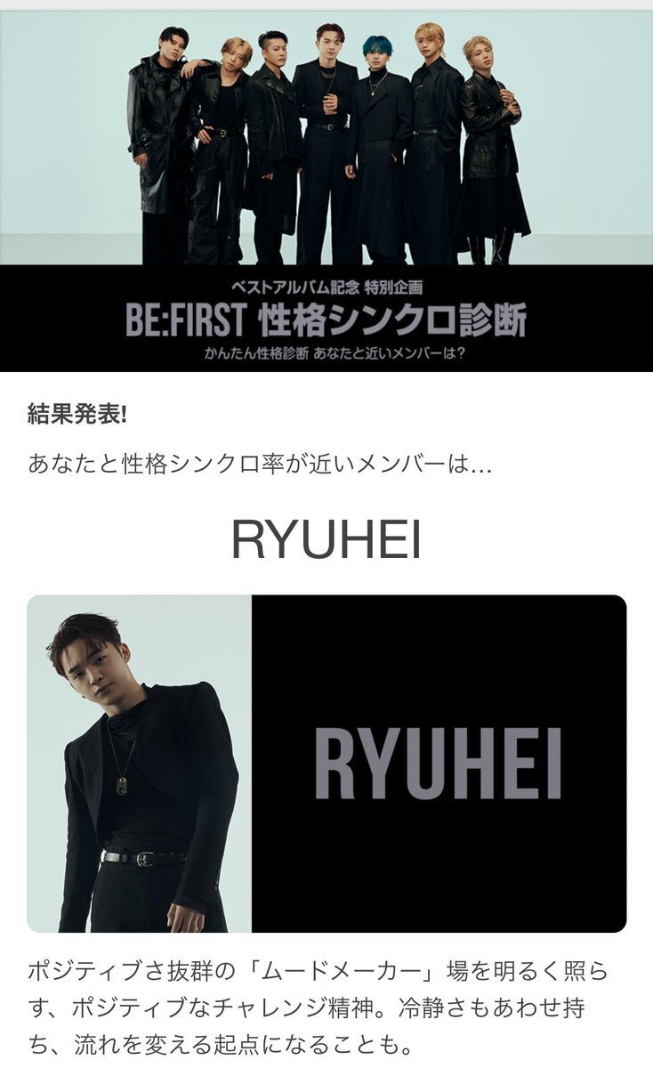 性格シンクロ率が近いメンバーはRYUHEIさんでした! yahoo.jp/i8QpCr #BEFIRST性格シンクロ診断 #BEFIRST #ヤフー検索 おぉー!!!🐉🤝🏻🎶