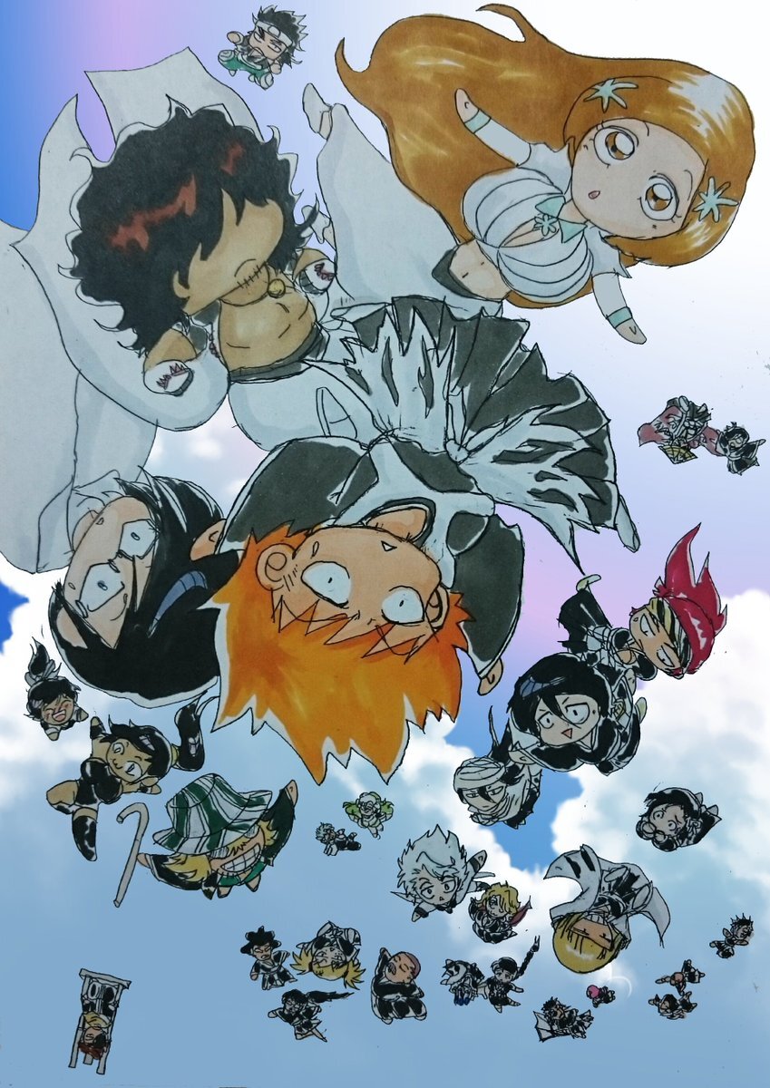 描いてたBLEACH血戦篇の絵♪ 出来るだけみんなを描いてみた! 全部の戦い終わって空からぽ~んってみんなで帰ればいいよね♪ ってイメージで描いてみた♪ #BLEACH絵描きさんと繋がりたい pic.x.com/eVBULEC3hZ