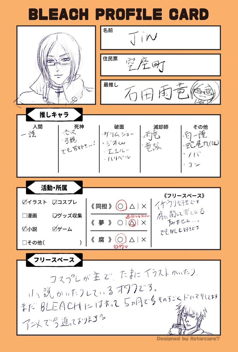 今年どハマりしてイラストやコスしてます!まだ履修中ですが鰤好きな方と繋がりたいです……!誤反応怖いのでRT中心にいいねもご挨拶に伺います……! #BLEACH好きな人と繋がりたい #BLEACH絵描きさんと繋がりたい #BLEACHPROFILECARD pic.x.com/L6uoOzR63T