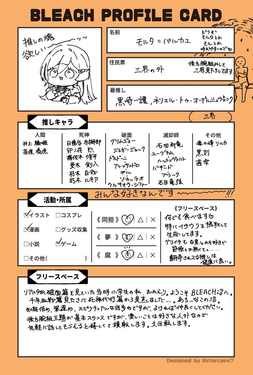 素敵なテンプレお借りしました! ♡orRPで気になった方お迎えいきます🫶 低浮上の時もありますが… ご縁があれば嬉しいです、よろしくお願いします! #BLEACHPROFILECARD #BLEACH好きな人と繋がりたい #BLEACH絵描きさんと繋がりたい pic.x.com/zyTijeE7Kq