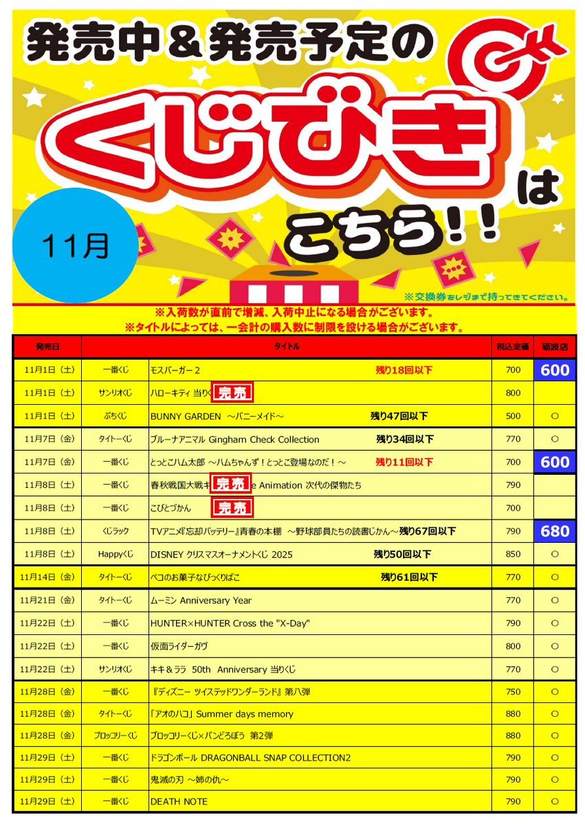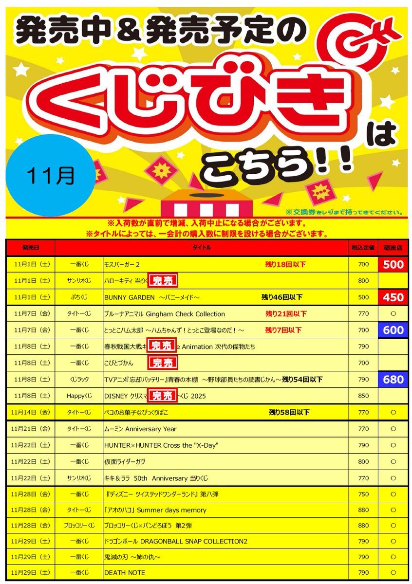 11月発売予定のくじ各種です(11/15更新) ※回数制限を設ける場合があります ※予約・取り置きはできません #モスバーガー2 #とっとこハム太郎 #忘却バッテリー #ムーミン #ハンターハンター #仮面ライダーガヴ #パンどろぼう #ブルーナアニマル #キキララ #鬼滅の刃  #BM砺波くじ pic.x.com/FkIquGRmsh