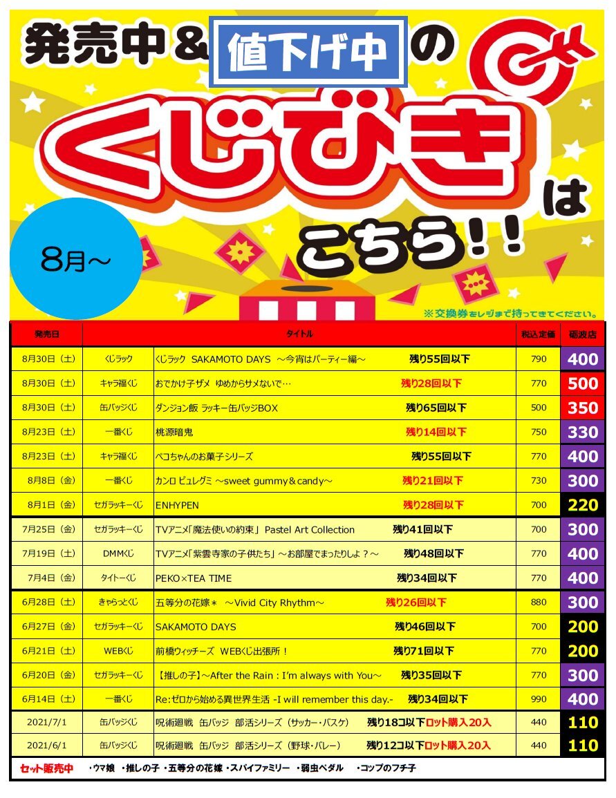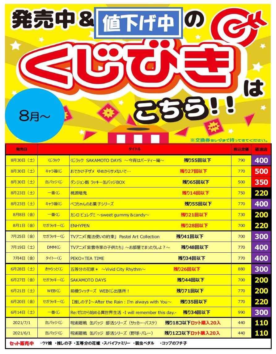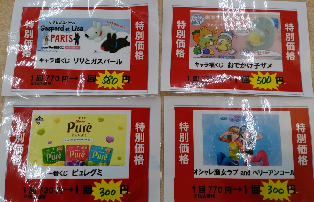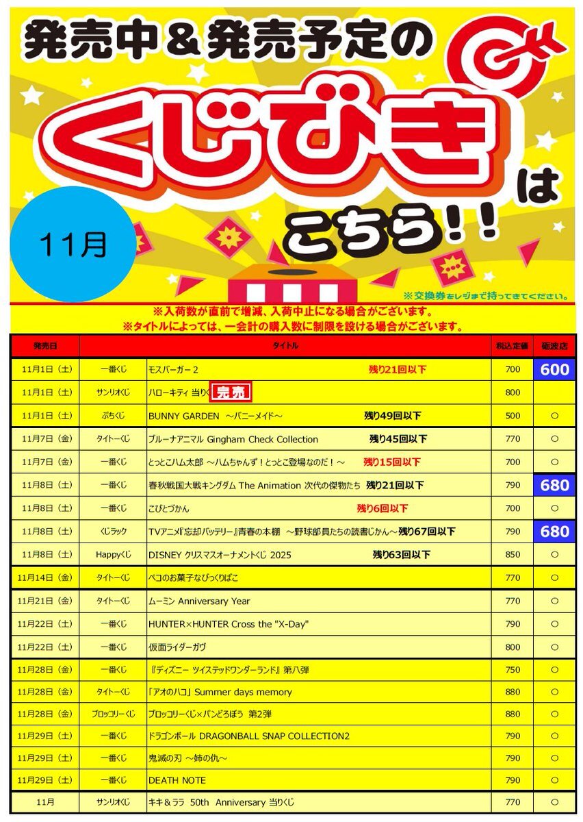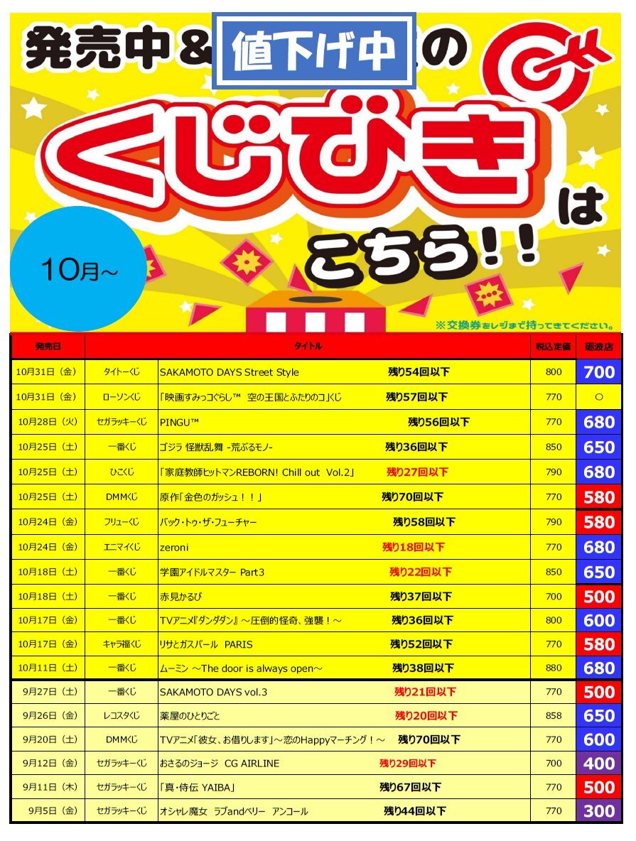 値下げ中のくじ各種です(11/15更新) ワンコインで引けるくじ色々ありますよ~ みなさまのご来店お待ちしております😊 #BM砺波くじ pic.x.com/dTe9dts2Xb