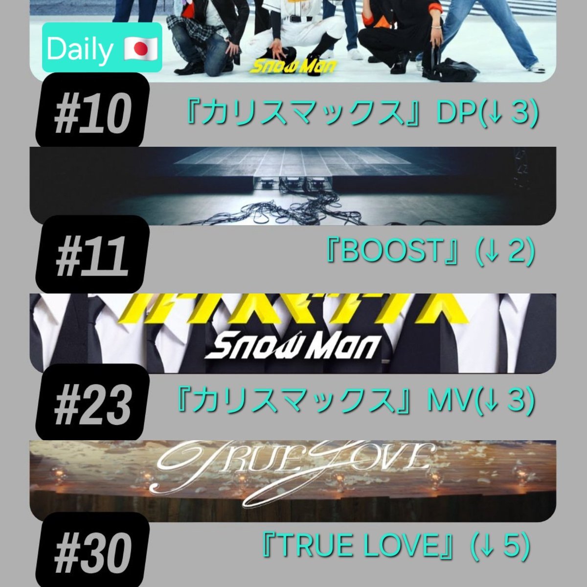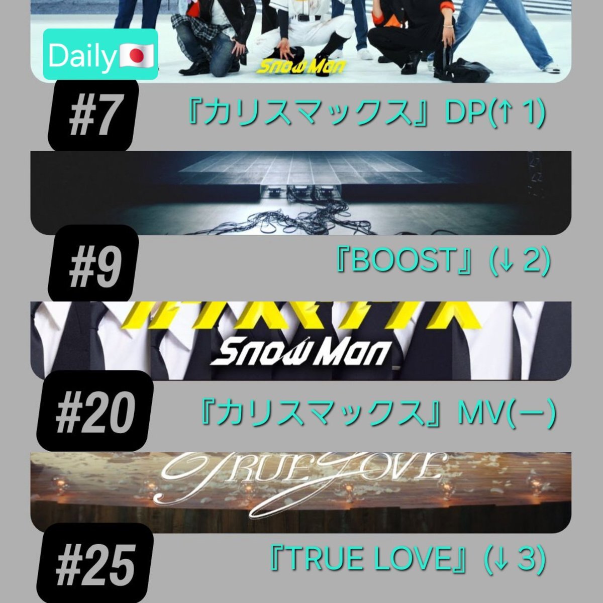 #Spotify_SnowMan #SnowMan #SnowManシェアリレー 🟢Spotify 11/06付 DailyArtist24位(↓1) TopSongsJapan “#カリスマックス”78位(↑10) Viral “#BOOST”88位(↑1) “#TRUELOVE”“#悪戯な天使”も 楽しく聴いてシェアしていきましょう🎧 短めリスト ↳open.spotify.com/playlist/1rYKl… ⛄ ↓Weekly出ました🆕️ x.com/kotomomonaomik…